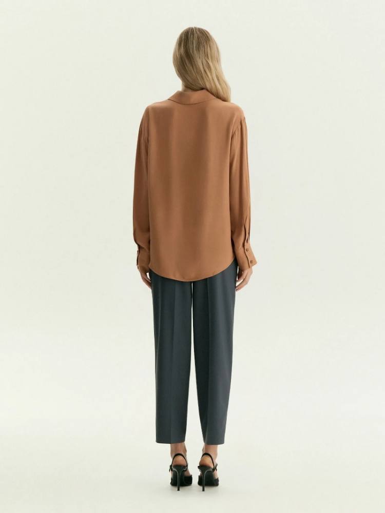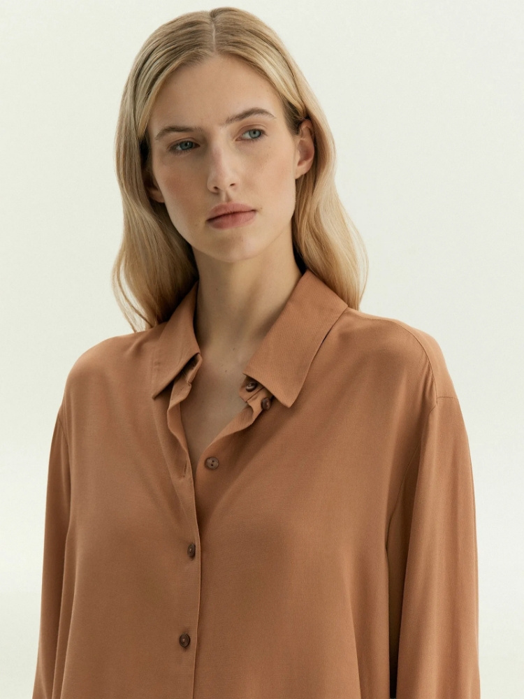 Рубашка классического кроя подойдёт для работы и личных дел. Тёплый и лёгкий коричнево-бежевый оттенок смотрится в образе дорого. Дышащая вискоза комфортна для первого и второго слоя. Модель выполнена без кокетки и складок. Сочетается как с денимом модных расцветок, так и с нежными юбками в бельевом стиле