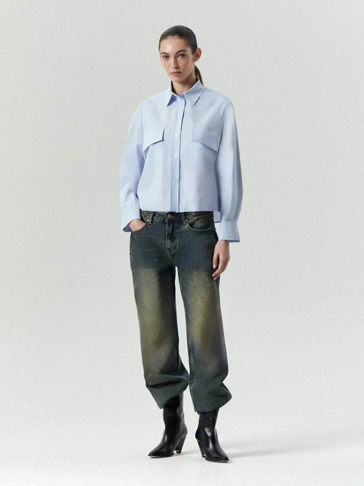 Рубашка в светлом голубом оттенке освежит офисные и кэжуальные образы. Выполнена из хлопка с небольшим добавлением эластана для комфортной посадки. Трендовая укороченная модель имеет подспущенный рукав с объемной проймой и складкой, а также накладные карманы. Хорошо подойдёт к брюкам или юбке с завышенной посадкой