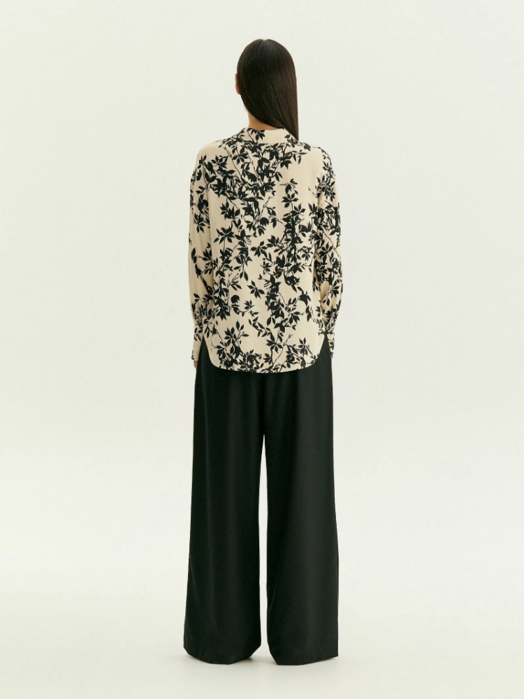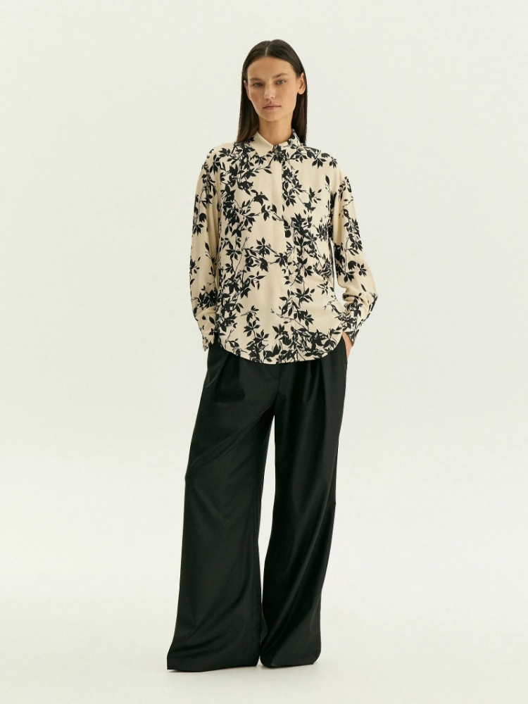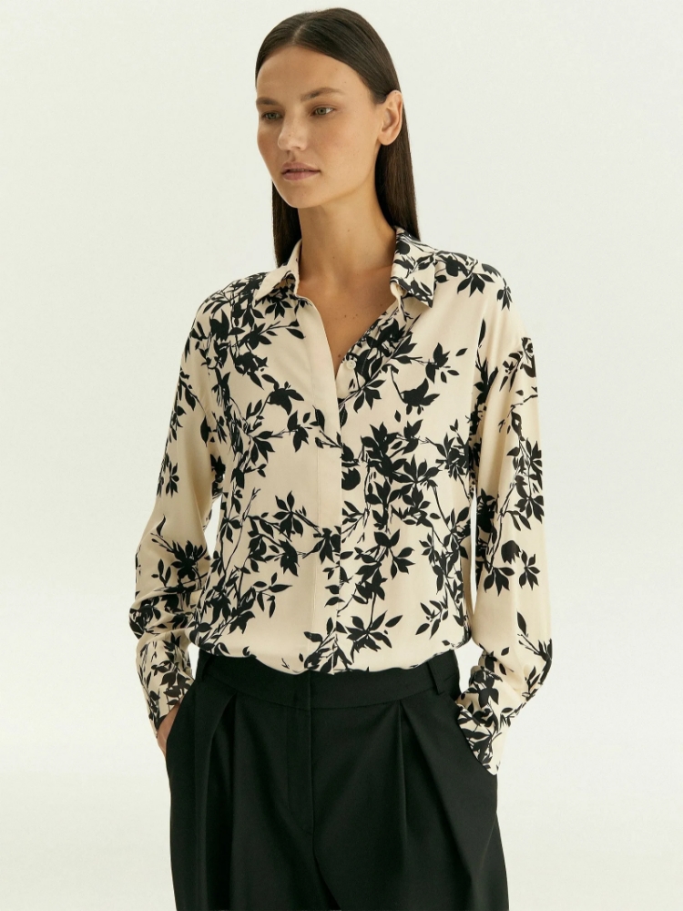 Незаменимая вещь в гардеробе — элегантная блуза с чёрным флоральным принтом на молочном фоне. Такой принт в таком сочетании цветов — пример неброского шика, который уместен и на рабочем месте, и на свидании. Пуговицы закрыты планкой, что делает вещь ещё изящнее. Материал из вискозы комфортно ощущается на теле