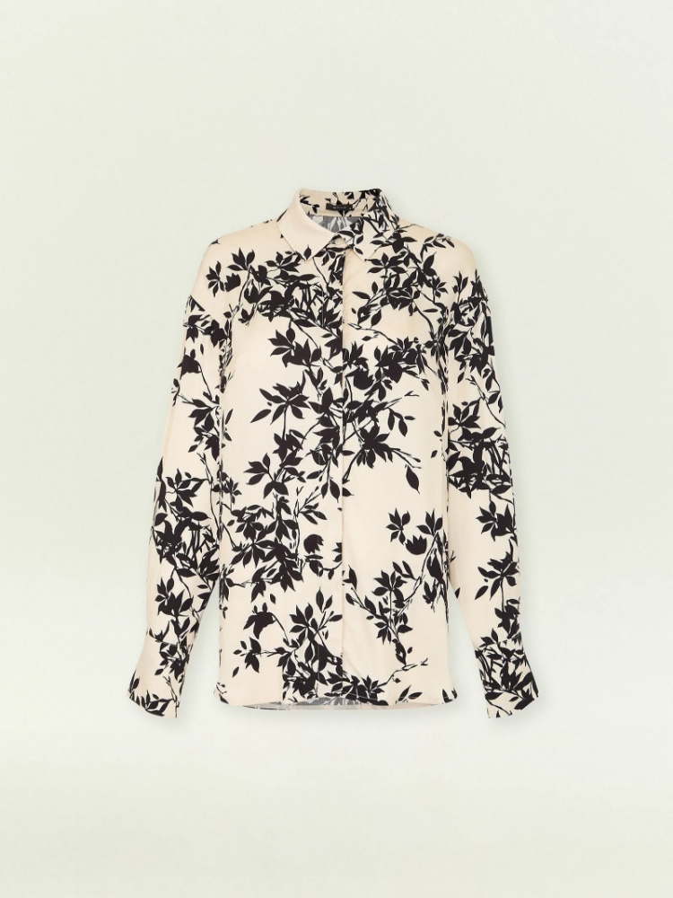 Незаменимая вещь в гардеробе — элегантная блуза с чёрным флоральным принтом на молочном фоне. Такой принт в таком сочетании цветов — пример неброского шика, который уместен и на рабочем месте, и на свидании. Пуговицы закрыты планкой, что делает вещь ещё изящнее. Материал из вискозы комфортно ощущается на теле
