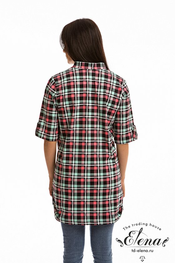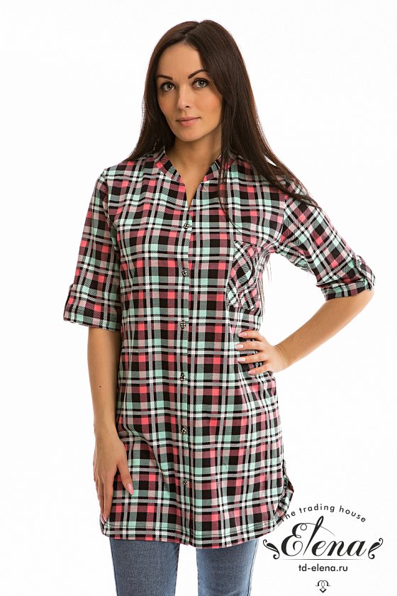 Рубашка с рукавом длиной 3/4 и центральной застёжкой на пуговицы. Воротник-стойка, спереди расположен накладной карман, на рукавах и снизу по бокам отделка паты.