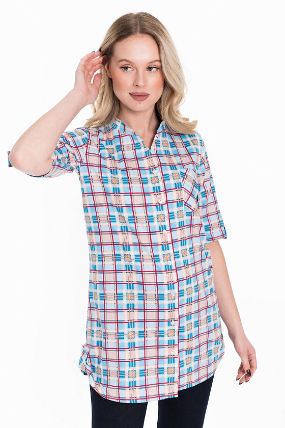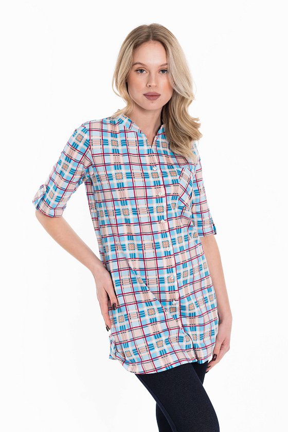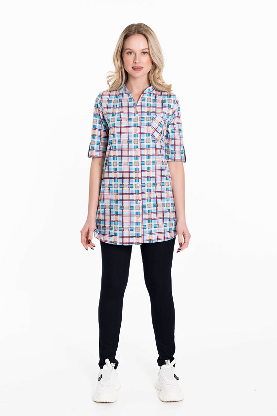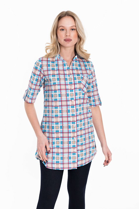 Рубашка с рукавом длиной 3/4 и центральной застёжкой на пуговицы. Воротник-стойка, спереди накладной карман, на рукавах и снизу по бокам отделка паты.