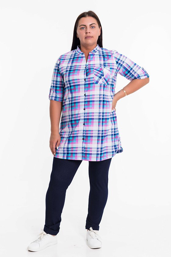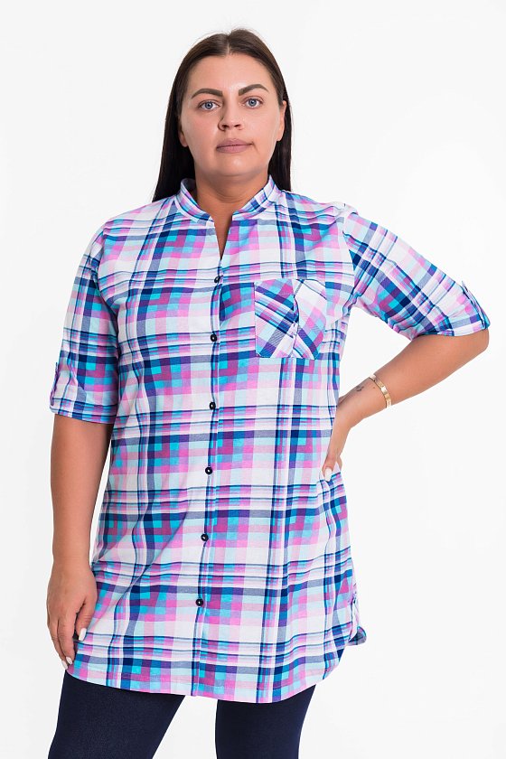 Рубашка с рукавом длиной 3/4 и центральной застёжкой на пуговицы. Воротник-стойка, спереди накладной карман, на рукавах и снизу по бокам отделка паты.