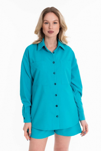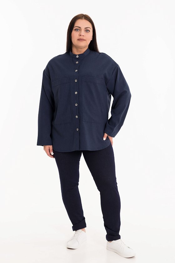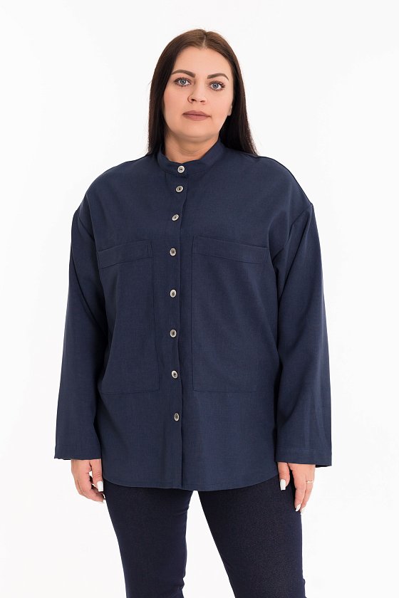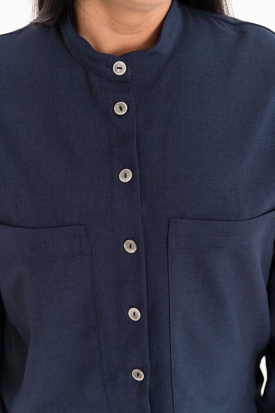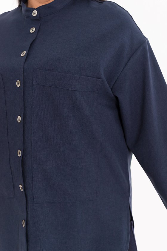 Женская рубашка свободного силуэта из однотонного искусственного льна синего цвета. С центральной застежкой на пуговицы, воротником стойкой и длинным рукавом рубашечного покроя. Рукав прямой без манжеты для легкого отворота. Спереди декоративные длинные накладные карманы.
