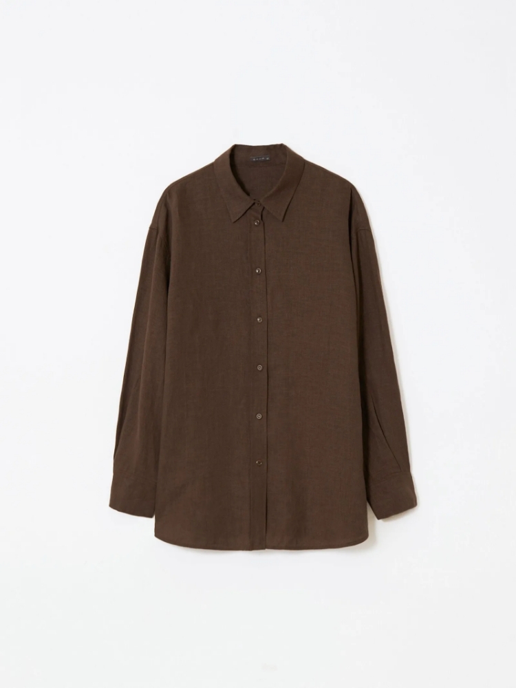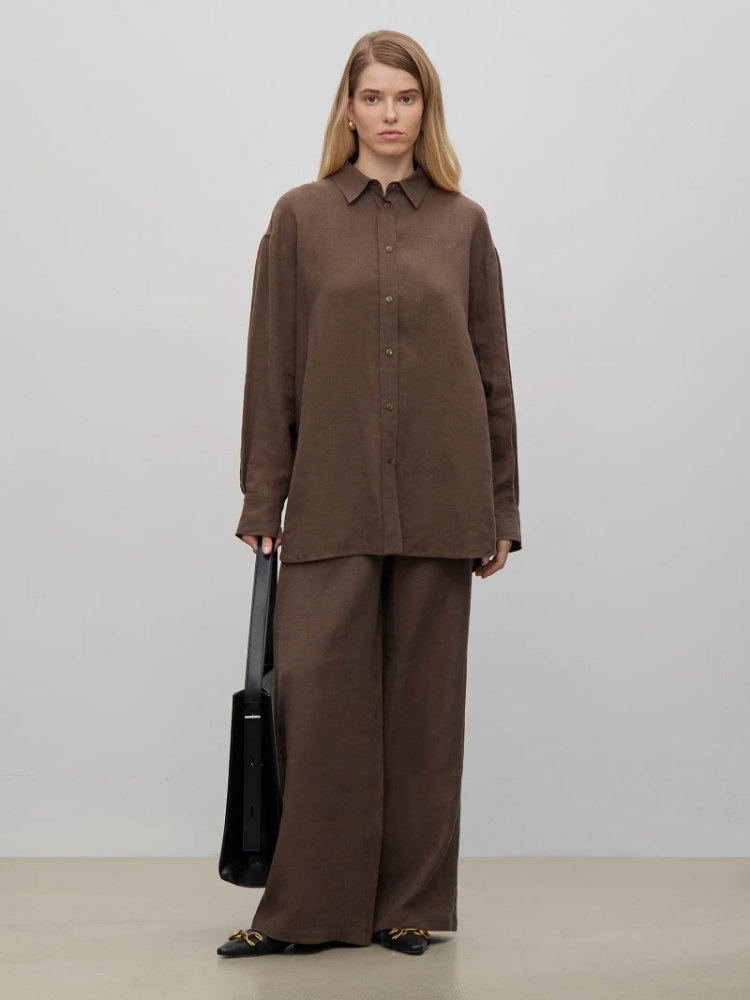 Рубашка изо льна в кофейном цвете. Удлинённая модель отличается ещё одной планкой с рядом пуговиц на спинке. Это позволяет регулировать степень открытости, создавая более смелые стилизации. Завершить образ с рубашкой можно брюками из комплекта