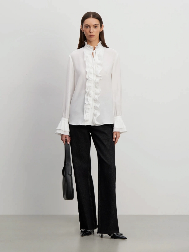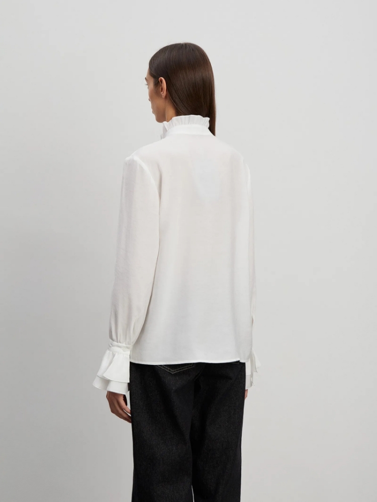 Нарядная рубашка придаст образу большей эстетичности. Модель прямого кроя украшена невысоким воротником-стойкой из рюшей и отделана планкой из воланов. Низ рукавов также выполнен в виде воланов. Рубашка выполнена из комфортной к телу вискозы в молочном цвете. Сочетается с любым базовым низом, подходит для работы и торжественных случаев