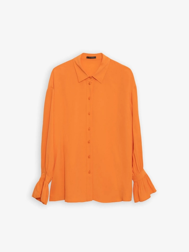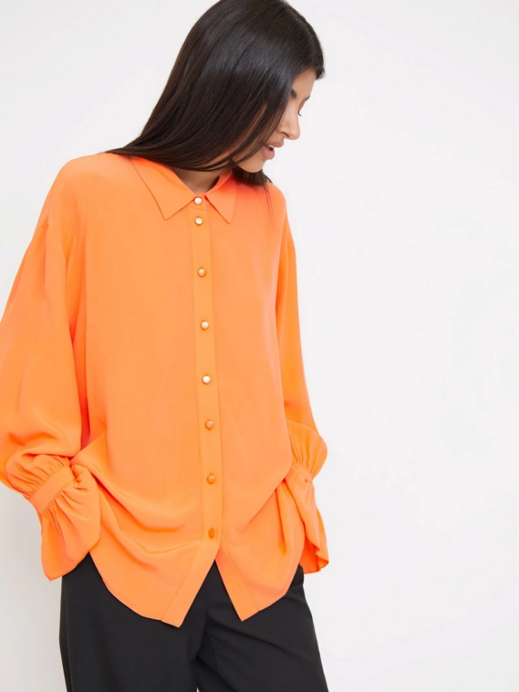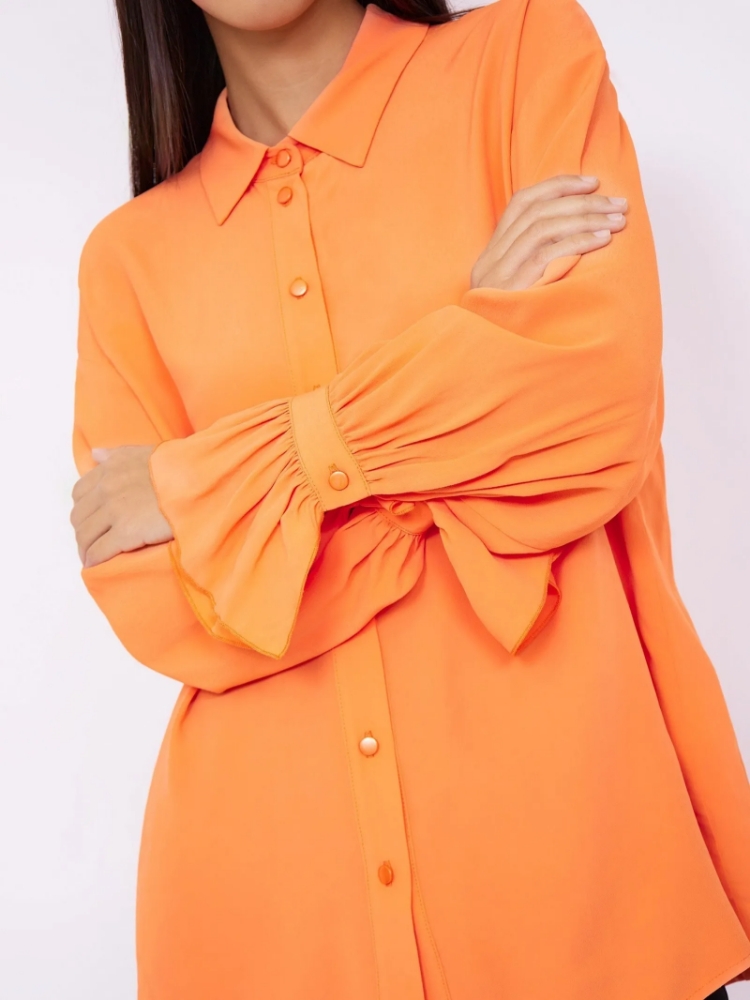 Яркая рубашка мандаринового цвета задаст позитивный тон всему дню. Манжеты клёш со сборкой делают образ наряднее. Отложной воротник регулируется пуговицами в тон рубашки. Рубашка отлично подойдёт как на каждый день, так и для особого случая