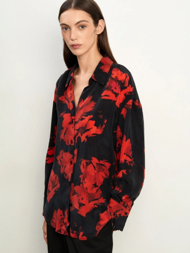 Рубашка со смелыми мазками алого цвета на чёрном фоне — модная вещь сезона. Выполнена из купры: это тактильно приятный, шелковистый материал на основе вискозы. Модель прямого кроя отличает спущенный рукав и планка на шлице. Шлицы рукавов декорированы пуговицами. На спинке имеется кокетка без складки. Изделие застёгивается на некрупные пуговицы. Рубашка отлично дополнит базовые брюки или джинсы