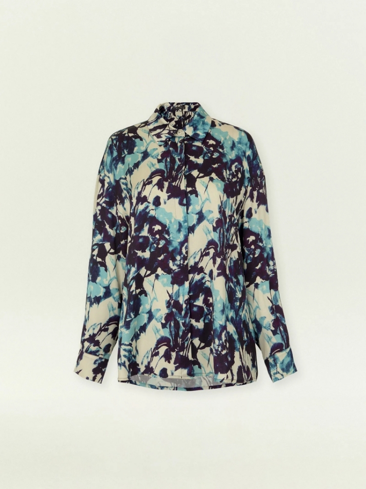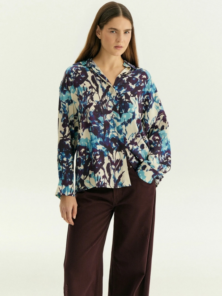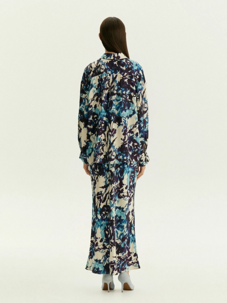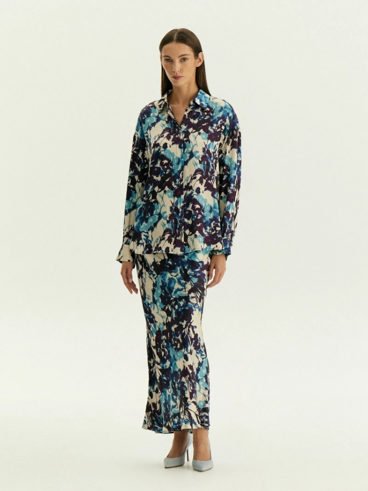 Классическая рубашка сделана из нежной, шелковистой вискозы и украшена актуальным принтом. Абстрактная композиция на основе растительных мотивов соединяет в себе трендовые оттенки фиолетового и синего. Завершить образ можно юбкой из комплекта или базовым костюмным низом в сочетании с жакетом