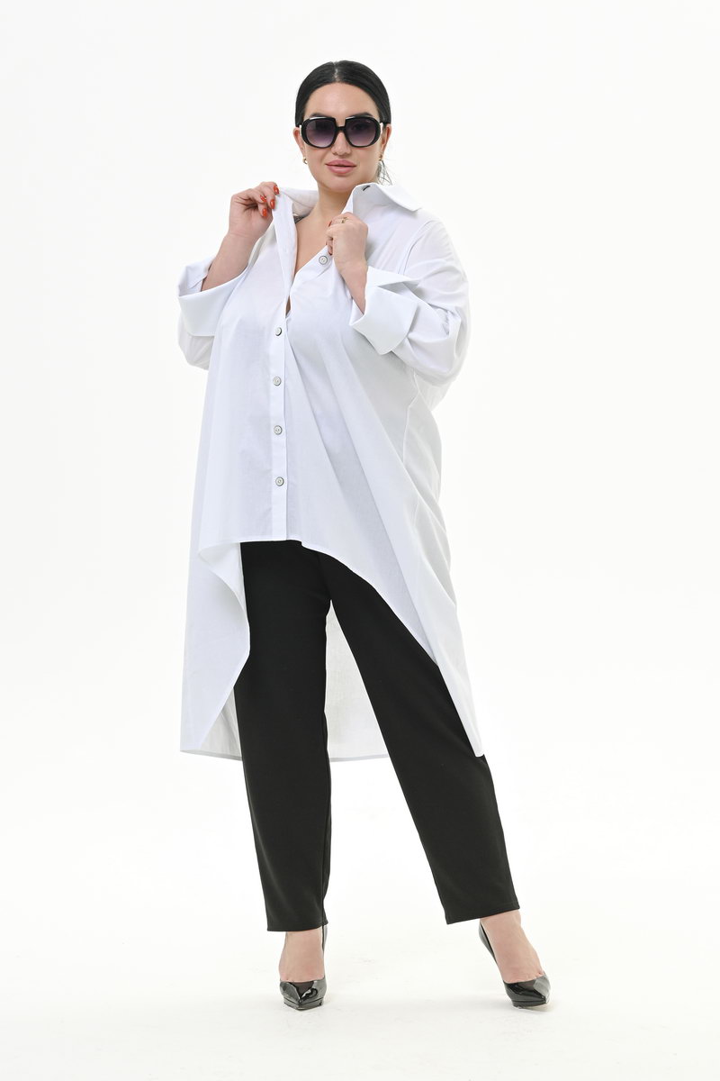 Стильная длинная рубашка А-силуэта из хлопка с эластаном с фигурной формой линии низа.