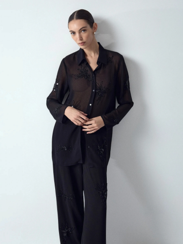 Невесомая прозрачная рубашка выполнена из тончайшего шифона, который украшен цветочным узором из стекляруса, пайеток и бисера. У рукавов нет манжетов и пуговиц: это делает фасон более неформальным. Шифоновая рубашка свободного кроя отлично подходит в качестве второго слоя. Может сочетаться с брюками и кимоно из комплекта, золотым или чёрным топом, другими вариантами первого слоя и низа. Такая вещь в гардеробе поможет открыть новые грани своего стиля и создать современный образ, в котором традиции сочетаются со свежими трендами сезона