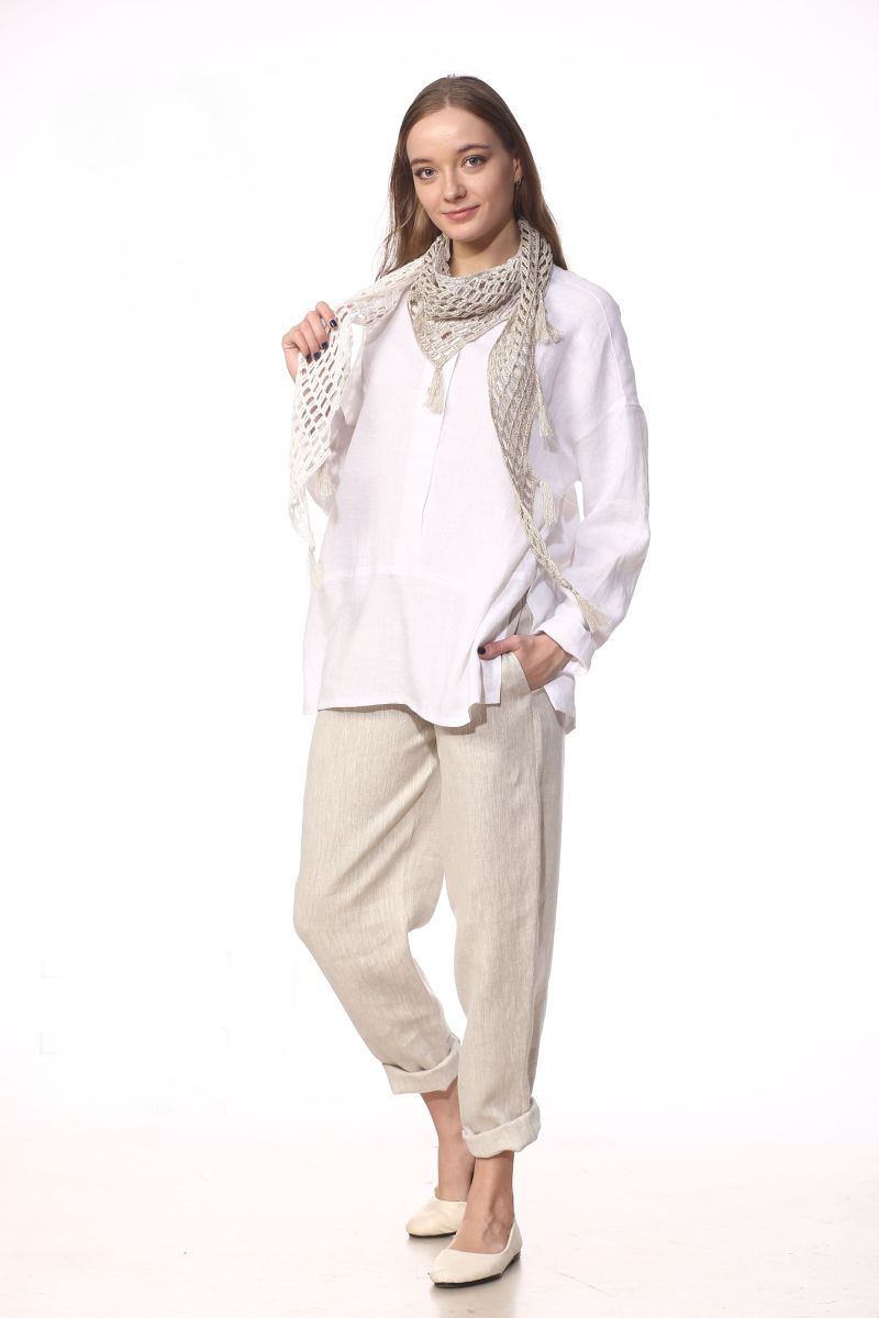 Описание: Рубашка, круглый вырез горловины, вверху на планке 3 пуговицы, по бокам разрезы, лен.