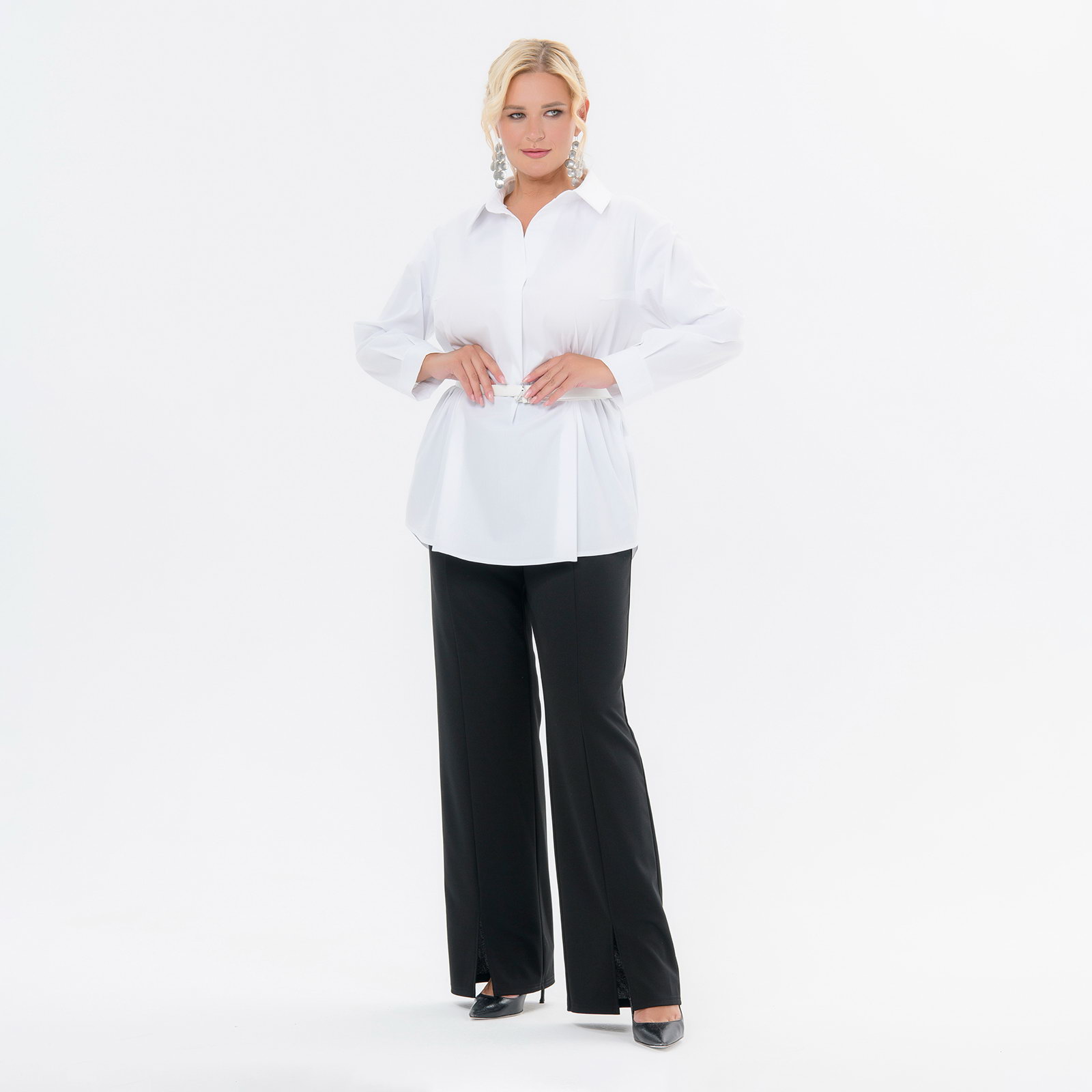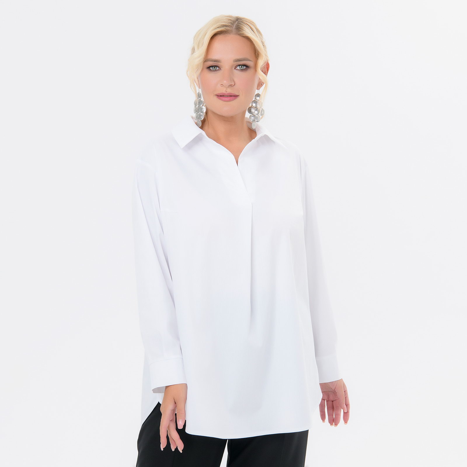 Свободная рубашка из хлопка. Линия плеча спущена, низ рукава присборен, заканчивается манжетом. По переду V-вырез, переходящий в складку.