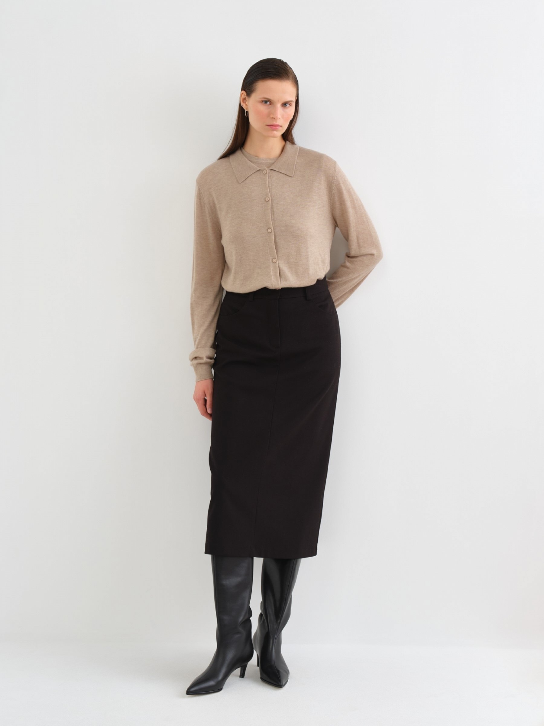 Классическая рубашка в трикотаже – интересная альтернатива обычной. Смотрится так же лаконично, но более уютно и расслабленно, поэтому подходит и для офиса, и для casual-луков. Выполнена в удлиненном силуэте, который визуально вытягивает линии и стройнит. Выбрали для нее воздушное смесовое полотно гладкой вязки с отборной шерстью мериноса, поэтому рубашка особо мягкая и комфортная. Для идеального дуэта рекомендуем топ без рукавов в тон.