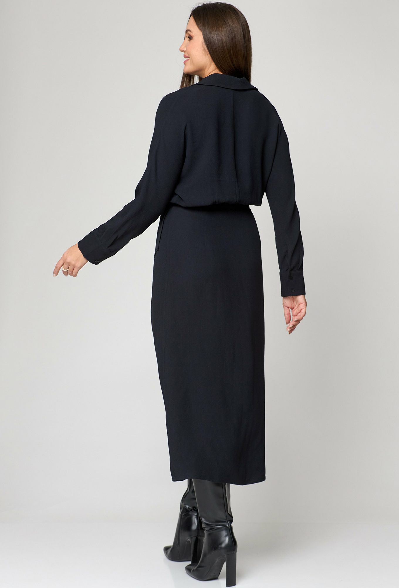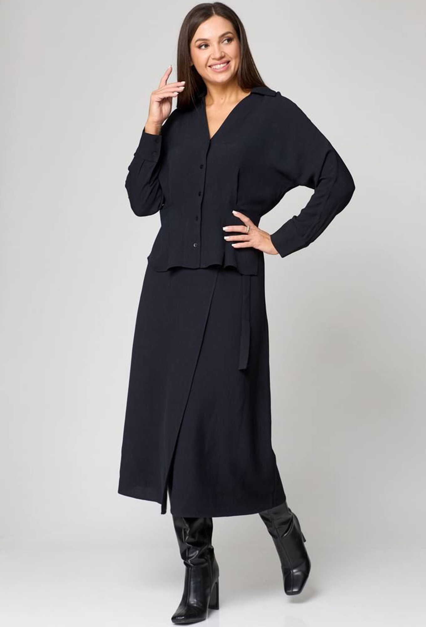 Оригинальное платье (имитация блузки и юбки) отрезное по линии талии с цельнокроеным рукавом. По низу рукава складки собраны на манжету с застежкой на 2 пуговицы. Воротник рубашечного типа с притачной стойкой. Застежка центрально-бортовая в верхней части на 5 пуговиц. Верхняя часть спинки свободная, со средним швом и присобрана на притачной к нижней, расширенной к низу части. Нижняя часть - юбка на запах с застежкой на потайную пуговицу и пряжкой на верхней половинке. Платье можно носить в 3 вариациях, разрез юбки регулировать с помощью пояса, заправлять блузон или на выпуск.