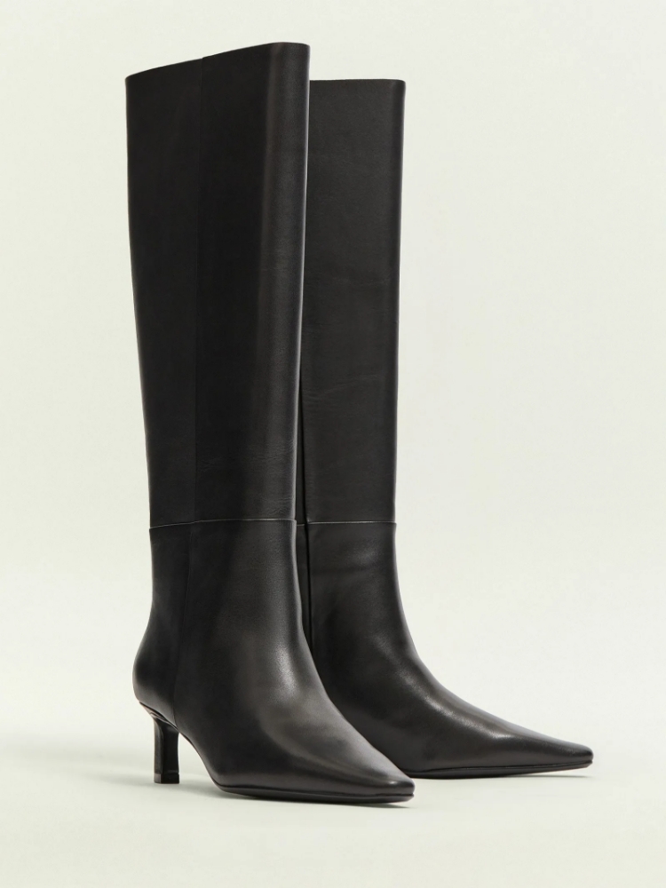 Чёрные сапоги-трубы из натуральной кожи. Высота каблука — 5,5 см. Разработанная с заботой о вашем удобстве колодка и устойчивый каблук позволяют носить эту обувь весь день и чувствовать себя в ней комфортно. Актуальная базовая модель на каждый день подойдёт к большинству повседневных образов