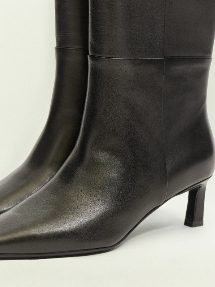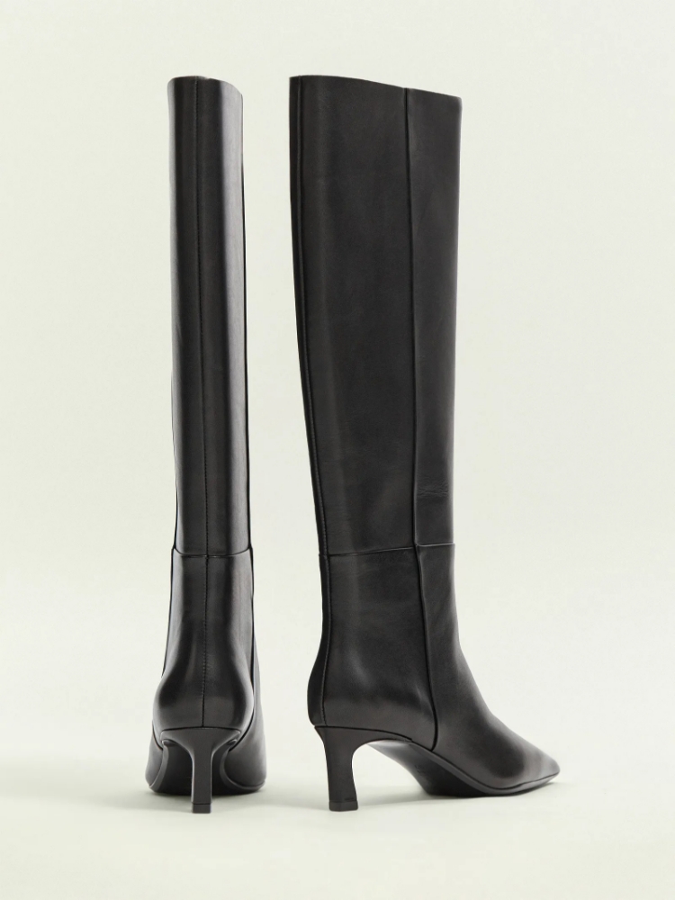 Чёрные сапоги-трубы из натуральной кожи. Высота каблука — 5,5 см. Разработанная с заботой о вашем удобстве колодка и устойчивый каблук позволяют носить эту обувь весь день и чувствовать себя в ней комфортно. Актуальная базовая модель на каждый день подойдёт к большинству повседневных образов
