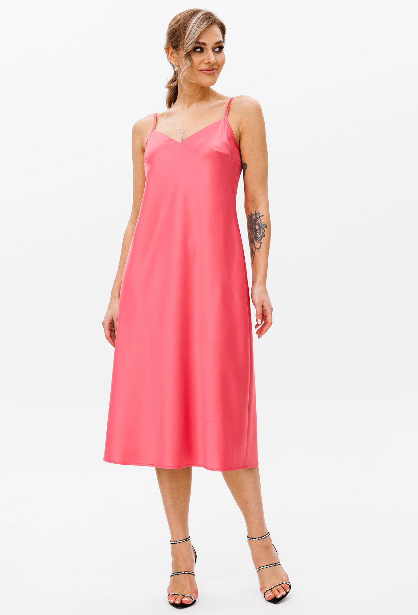 Платье - комбинация А-образного силуэта выполнено из атласа средней плотности на регулируемых бретельках. Перед с нагрудными вытачками. Спинка с талиевыми вытачками.