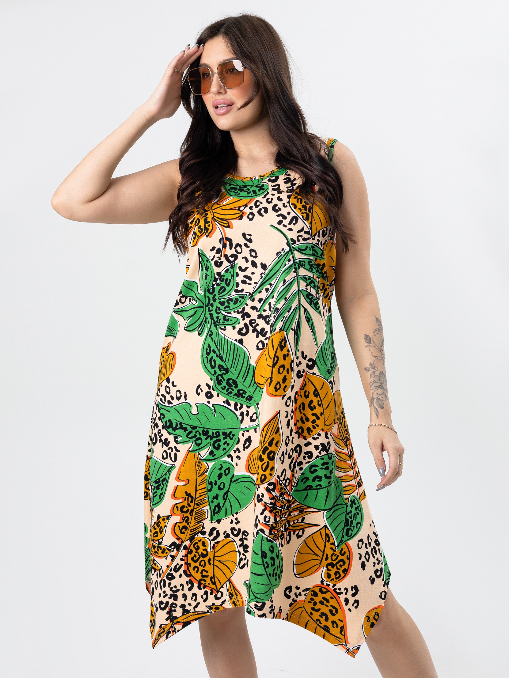 Сарафан женский летний на широких бретелях – это легкое и удобное летнее платье  без рукавов. Женский сарафан свободного кроя изготовлен из натурального хлопкового материала, что делает его дышащим и приятным для тела. Он идеально подходит для жаркой погоды, комфортен в повседневной носке и придает образу легкости и непринужденности. Такой наряд прекрасно дополнит летний гардероб и подчеркнет вашу женственность.  Сарафан женский больших размеров отлично подойдет для дома, для отдыха и прогулок, для пикников и пляжного отдыха. Благодаря простоте и универсальности дизайна, этот сарафан может стать идеальным выбором для отпуска или путешествий, когда вам нужна легкая и практичная одежда.