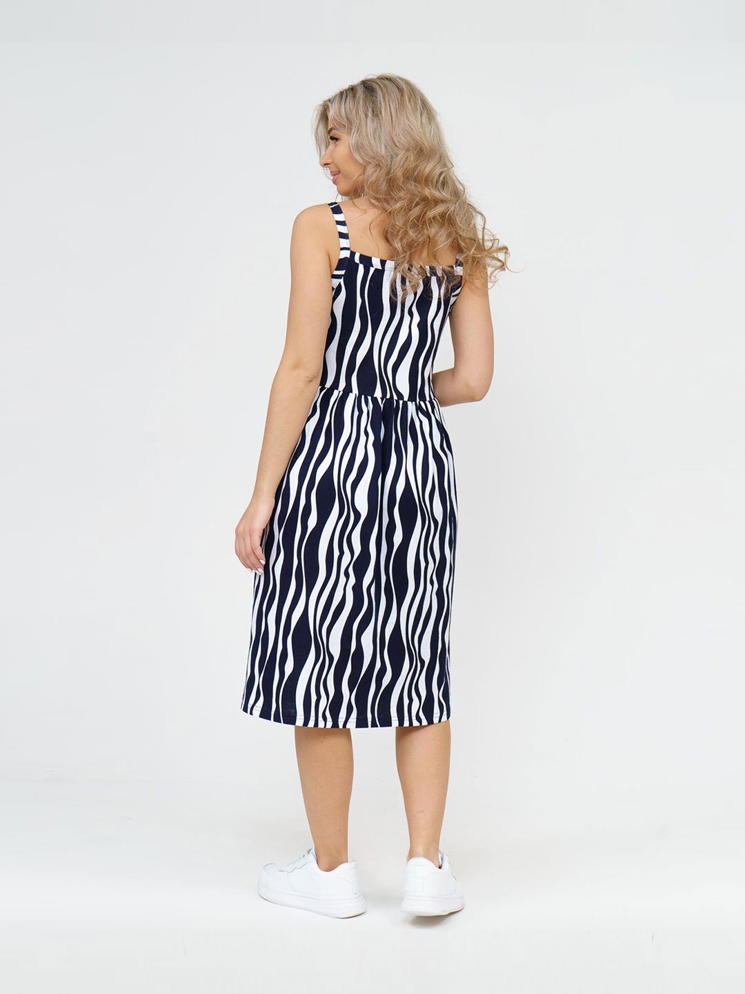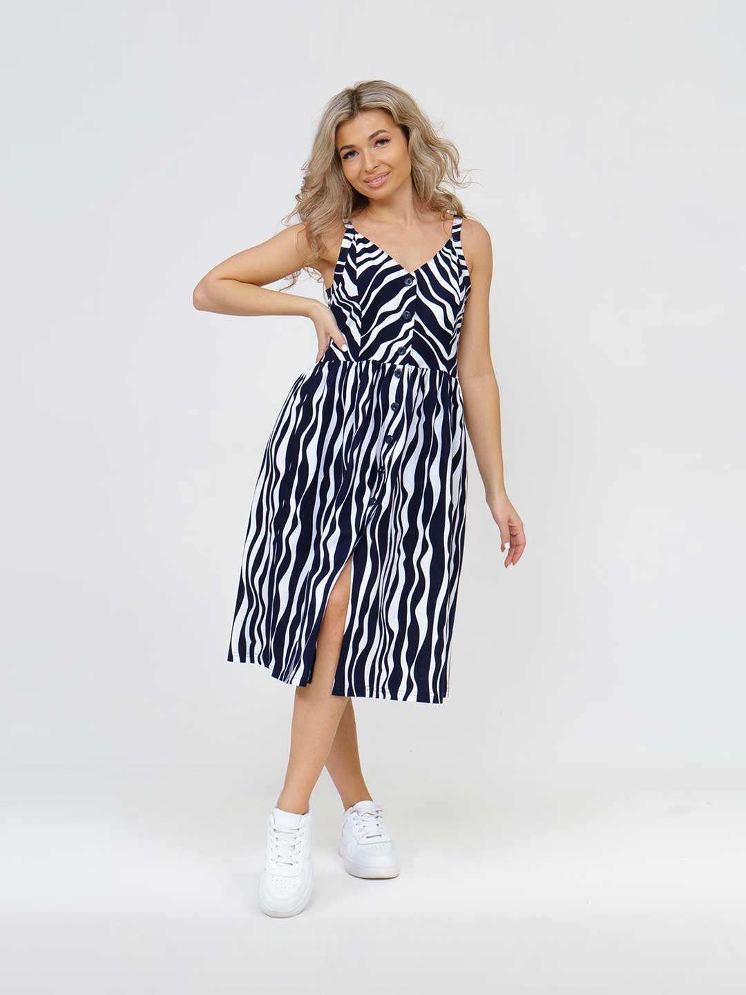 Сарафан длины миди на пуговицах. Полуприлегающего силуэта, отрезной по талии, на бретелях. Лиф разложен в диагональном направлении что придает сарафану изюминку. Сарафан выполнен из 100% хлопка, в нем вы будете чувствовать себя комфортно в жаркую погоду.