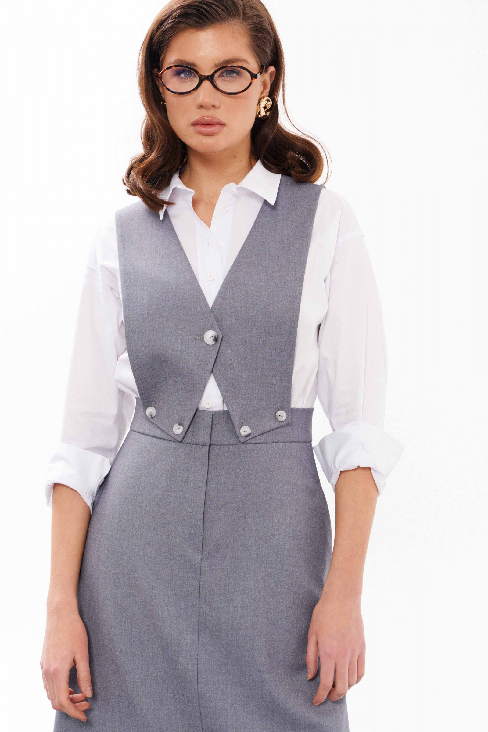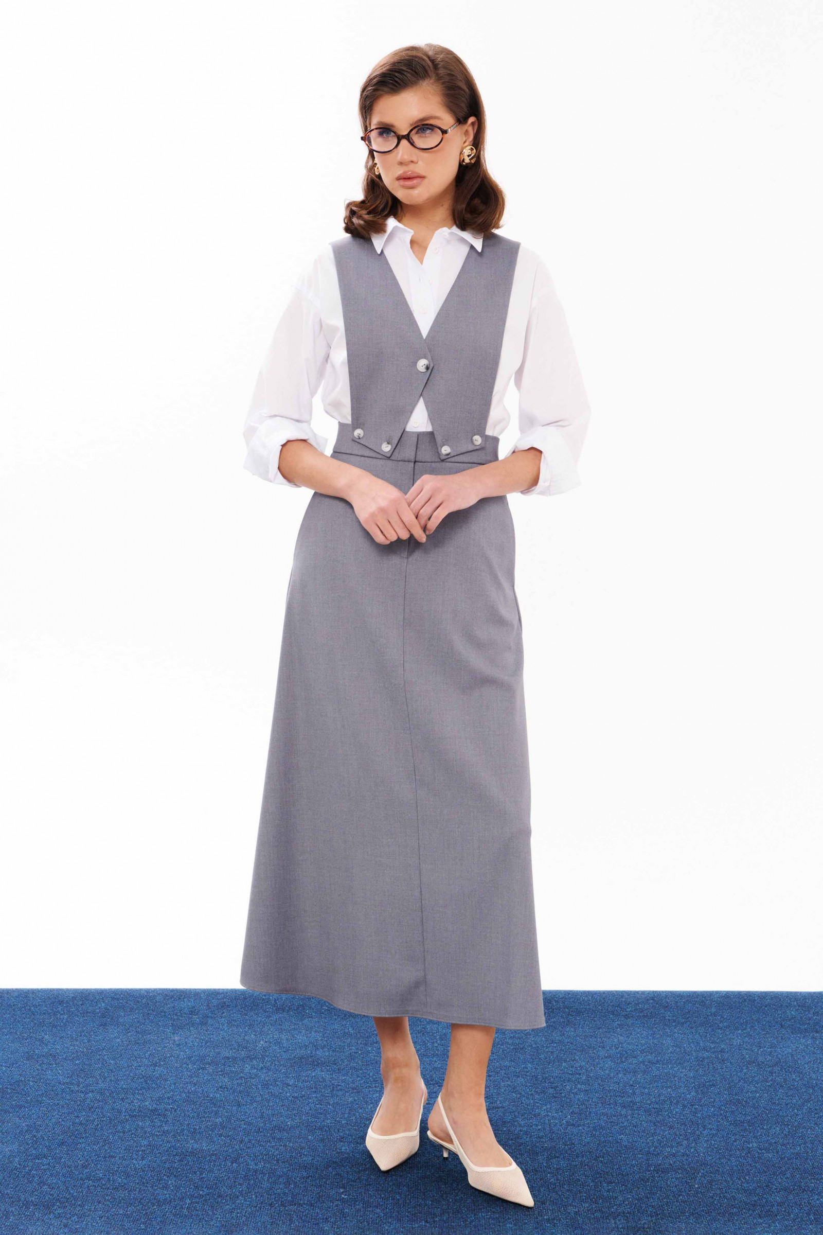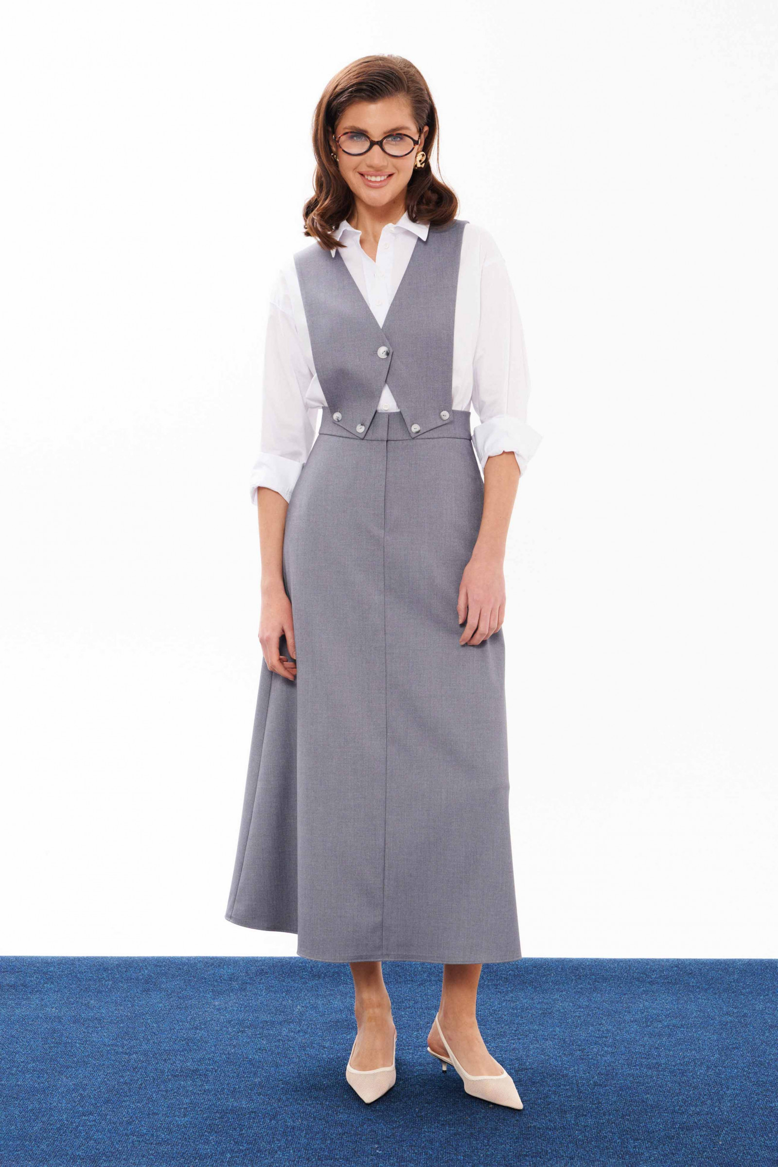 Сарафан женский из смесовой ткани для повседневной носки. Сарафан со съемным верхом. Жилет имеет центральную бортовую застежку на одну обметанную петлю и одну пуговицу. Жилет крепиться на пояс юбки с застежкой на обметанные петли и пуговицы. Юбка чуть расширена к низу. Верхний срез юбки обработан притачным поясом с застежкой на крючок, а также в среднем шве имеется застежка на тесьму-молнию. Заднее полотнище юбки имеет две талиевые вытачки. В боковых швах имеются потайные прорезные карманы. Данный сарафан очень многофункциональный, вы можете носить отдельно юбку и собирать стильные образы. Сарафан будет удобный и практичный в носке, а большое содержание вискозы подарит комфорт.