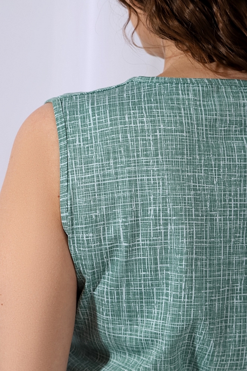 Сарафан из трикотажного полотна «кулирка» в сочетании двух видов в единой цветовой гамме: с мелкоузорчатым набивным рисунком, имитирующим ткацкое переплетение «рогожка» и с рисунком в мелкую клетку, отрезной по линии талии, с V-образной горловиной, центральной бортовой застежкой на обметанные петли и пуговицы и вышивкой на левой полочке лифа. Горловина спинки и проймы окантованы основным материалом. Юбка присборена по шву соединения с лифом. Съемный завязывающийся пояс фиксируется двумя шлевками из окантовки, вставленными в боковые швы на уровне талии.