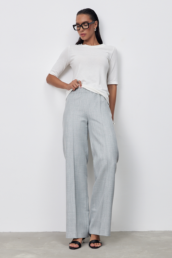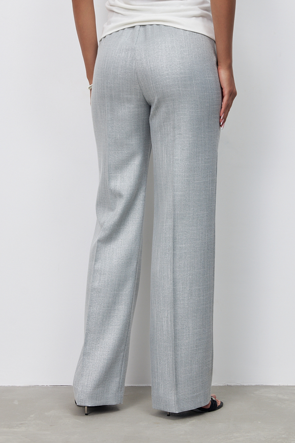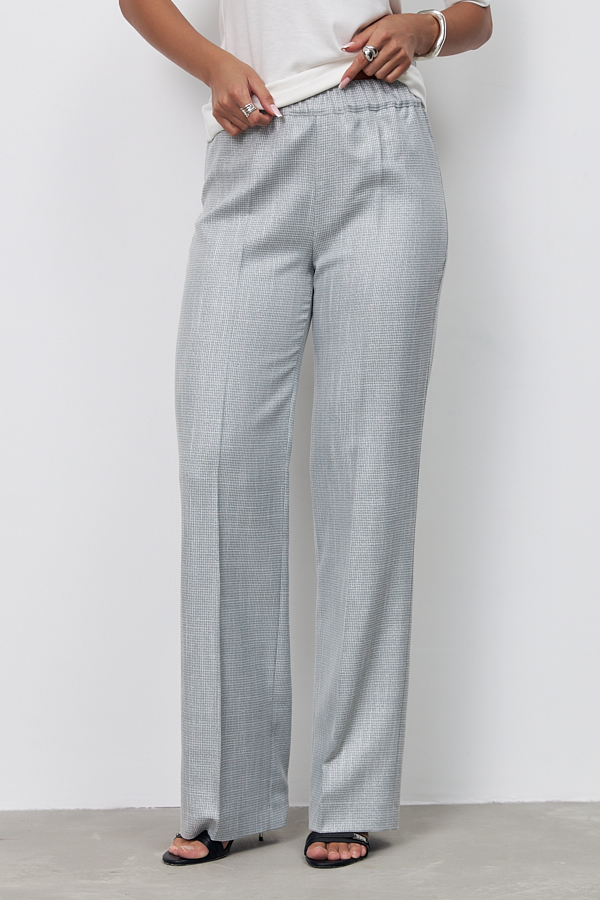 Брюки прямого силуэта из костюмной ткани. Пояс притачной с эластичной резиной.