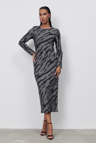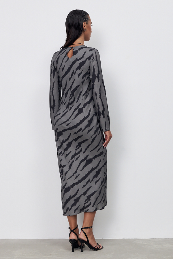 Платье прилегающего силуэта из вискозной ткани. Крой платья по косой. Втачной длинный рукав. Круглый вырез горловины, сзади застёжка на петлю-пуговицу.