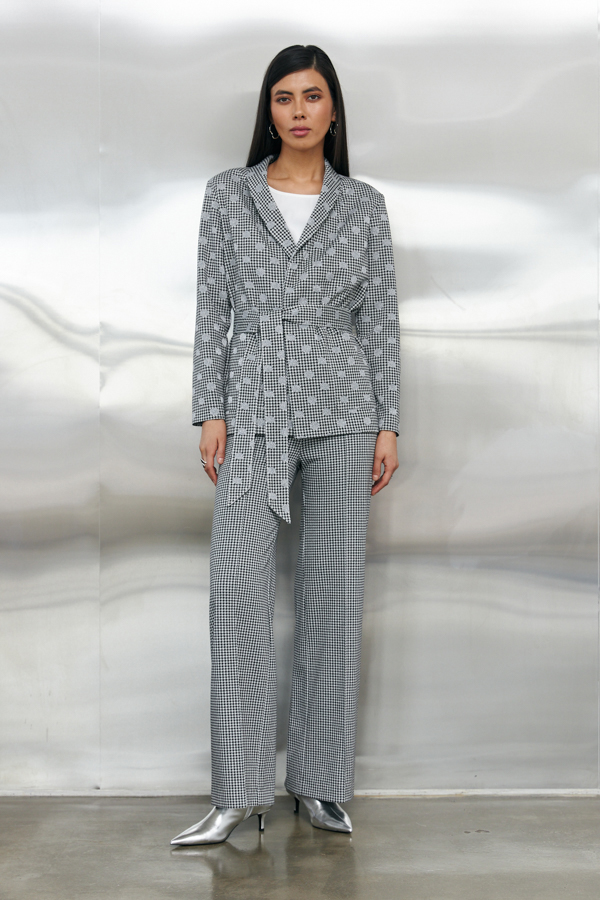 Костюм выполнен из эластичных тканей компаньонов. Брюки прямого силуэта. Пояс притачной с эластичной резиной. На передней части брюк застрочены стрелки. Жакет прямого свободного кроя с женственным шалевым воротником. На передней части изделия накладные карманы. Втачной рукав. Изделие с плечевыми накладками, которые при желании можно убрать. В комплекте пояс из основной ткани.