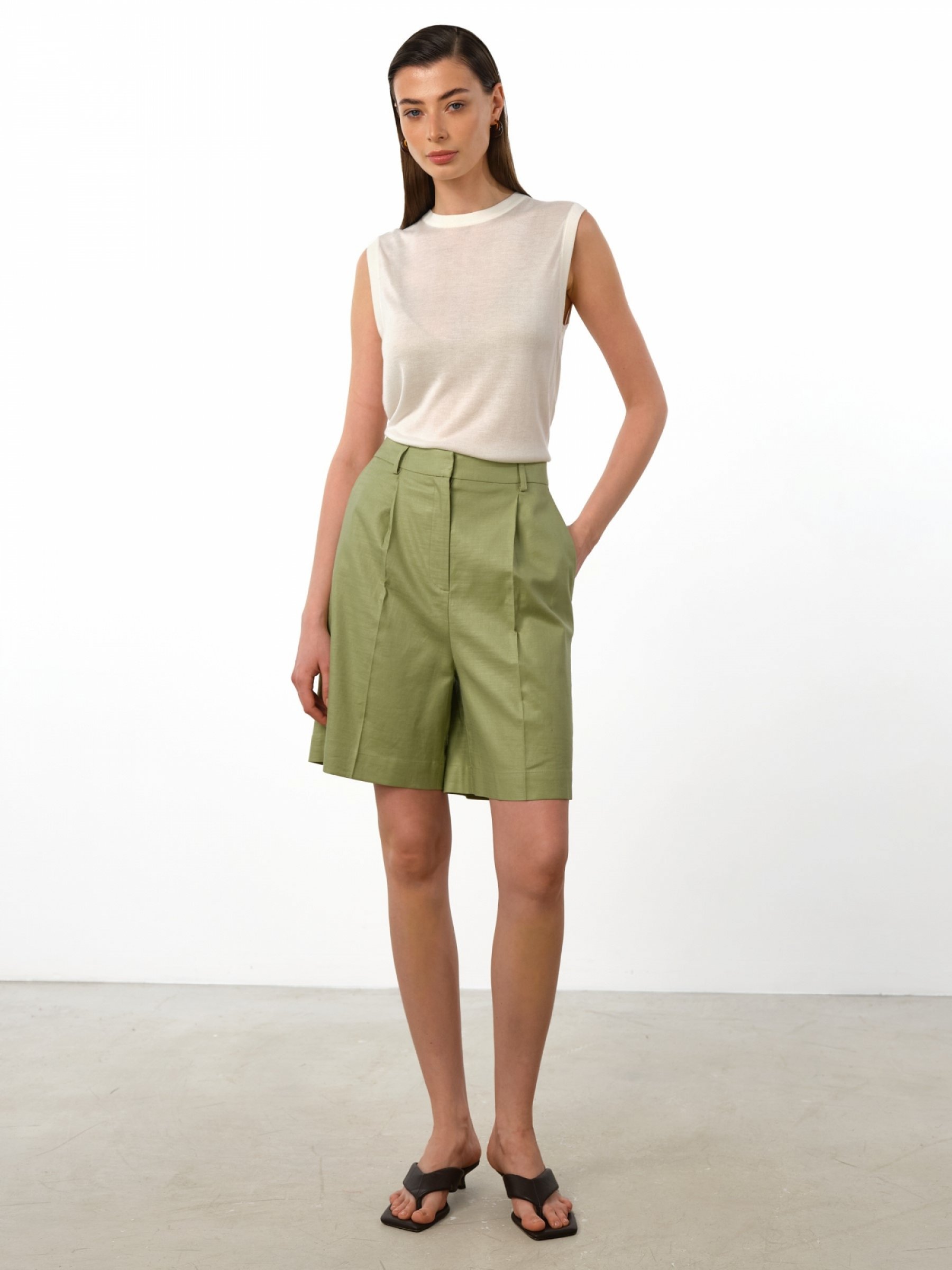 Стильные шорты прямого свободного кроя с классическими стрелками – удобные и легкие. Станут основой массы красивых образов, в том числе и самых смелых. Модель можно сочетать с любым подходящим вам верхом и обувью на плоской подошве. У изделия отрезной пояс со шлевками, боковые карманы и задние прорезные карманы с листочкой. Шорты застегиваются на потайную прозрачную пуговицу, металлический крючок и нейлоновую молнию в тон. Материал – мягкое невесомое смесовое полотно с добавлением отборного льна. Два красивых базовых цвета: мятный и бежевый. 67% вискоза 30% лен 3%спандекс