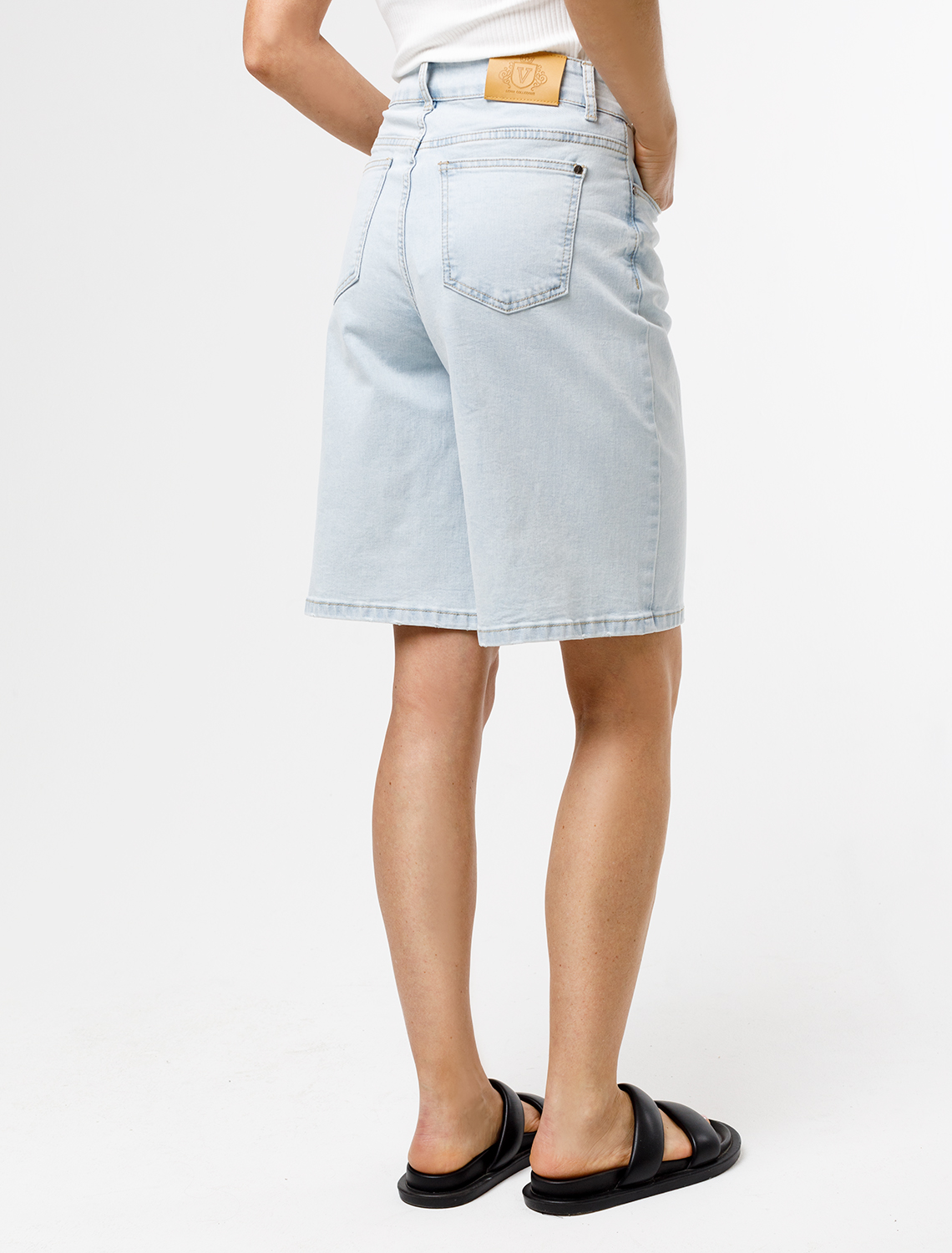 Шорты-бермуды выполнены из эластичного денима с декоративными потертостями. Изделие хорошо тянется и не сковывает движений. Подойдет для образов в любом сезоне. На поясе расположен брендированный патч.