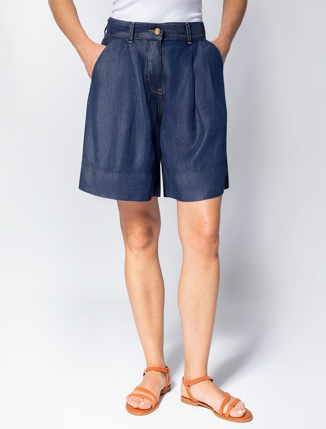 Шорты "бермуды" выполнены из струящегося 100% лиоцелла. Деним из такого материала обладает особой мягкостью и прочностью. Имеет полуматовый блеск, как у натурального шелка. Отлично холодит кожу в жаркое время года, сохраняя комфортный микроклимат. Глубокий синий цвет без стирки дополнен золотистой фурнитурой в стиле old-money. Сочетается в костюме с жакетом D51.030