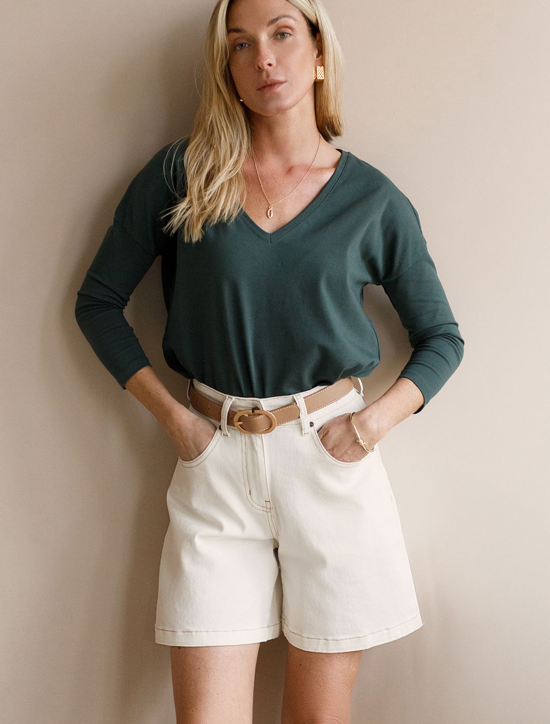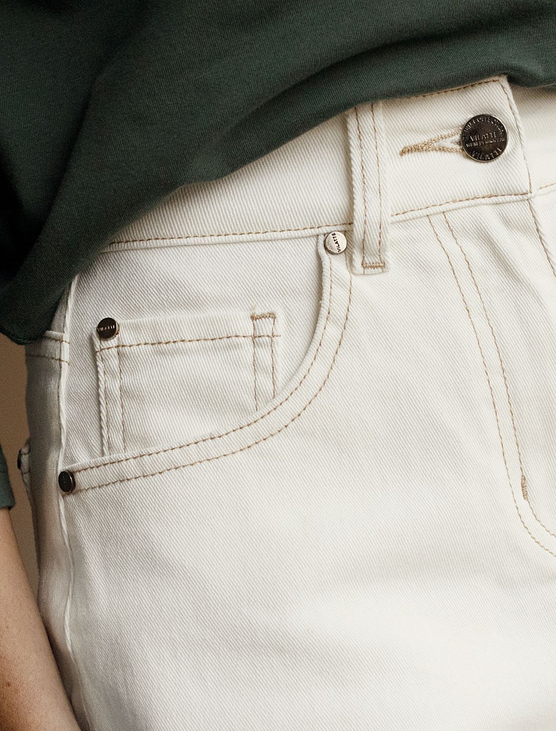 Шорты в теплом белом оттенке выполнены из хлопкового эластичного денима. Модель со средней посадкой, слегка расклешенная к низу, удачно гармонизирует фигуру и скрывает недостатки. Наличие эластана в составе изделия гарантирует комфорт и долговечность. Фирменный патч бренда.