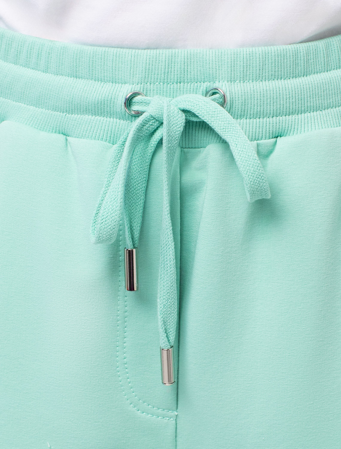 Шорты выполнены из футера двухнитки с эластаном. Модель прямого кроя дополнена боковыми карманами и одним задним карманом. Пояс выполнен из эластичного трикотажа в рубчик. В пояс вставлен плоский хлопковый шнур в тон изделия с серебристыми наконечниками. Изделие дополнено металлическим логотипом бренда. Сочетается в костюме с жакетом D49.078, джемпером D49.079, D49.080 и футболкой D49.081 мятный