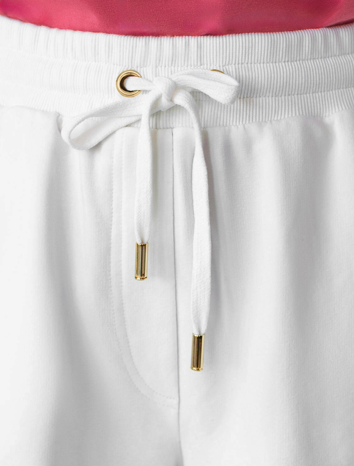 Шорты выполнены из футера двухнитки с эластаном. Модель прямого кроя дополнена боковыми карманами и одним задним карманом. Пояс выполнен из эластичного трикотажа в рубчик. В пояс вставлен плоский хлопковый шнур в тон изделия с золотистыми наконечниками. Изделие дополнено металлическим логотипом бренда. Сочетается в костюме с жакетом D49.078, джемпером D49.079, D49.080 и футболкой D49.081 молочный