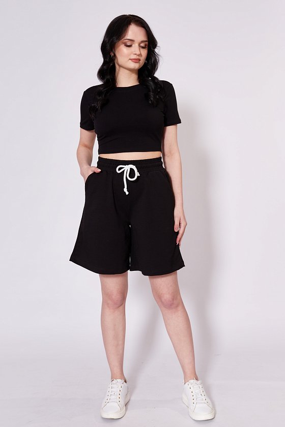 Женские шорты из однотонного футера с лайкрой. Расклешённый покрой, длина чуть выше колена. Шорты с боковыми карманами и поясом на резине и шнуре.