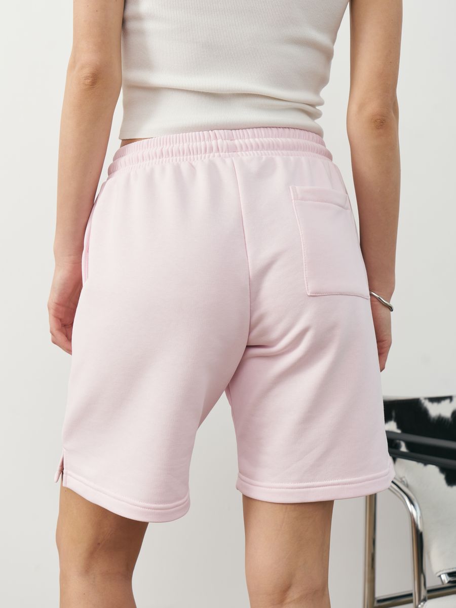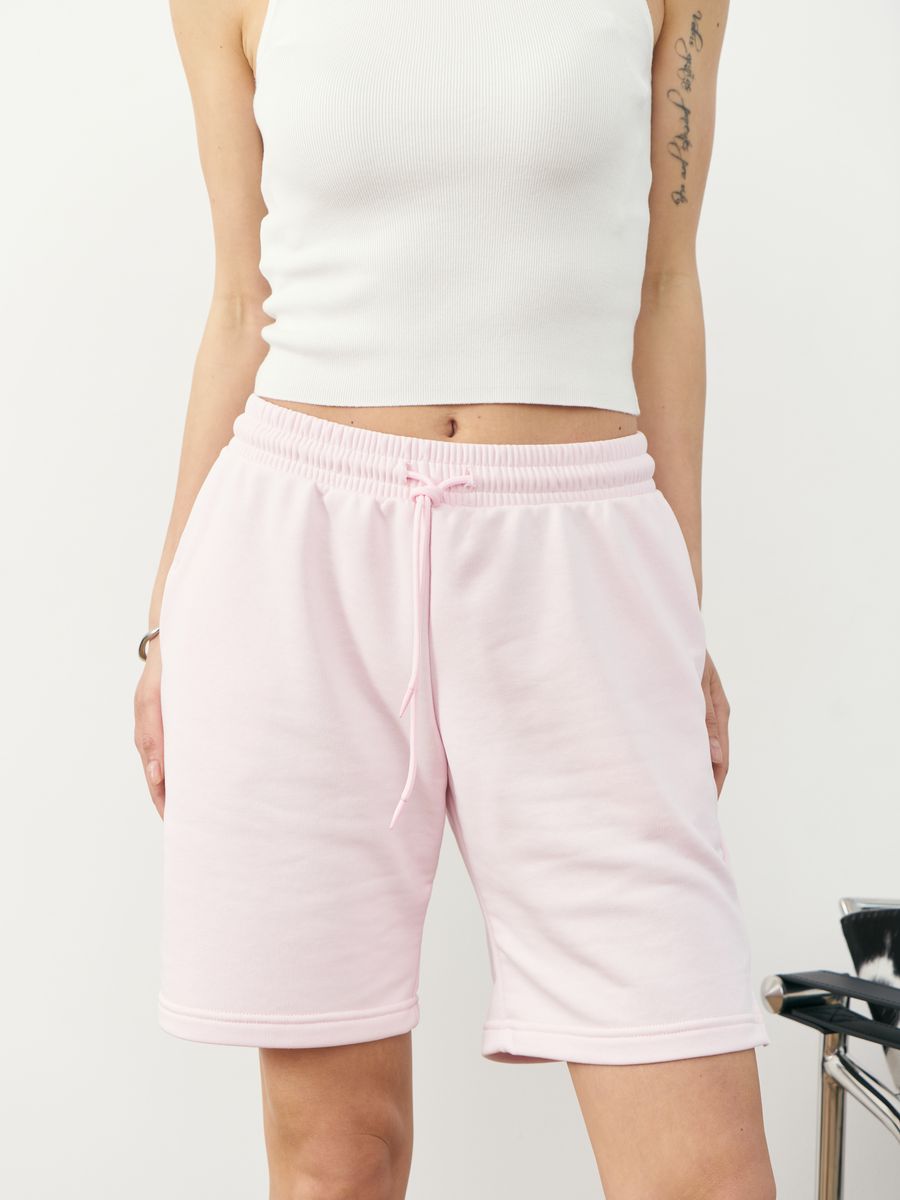 Женские шорты из футера 3-х нитка петля, с отрезным поясом, строчёным с эластичной тесьмой. С лицевой стороны пояса петли, через которые продет шнур. По боковым швам внизу – разрезы. 2 боковых кармана. На правой задней половинке шорт – накладной карман. Низ шорт подшит на плоскошовной машине.