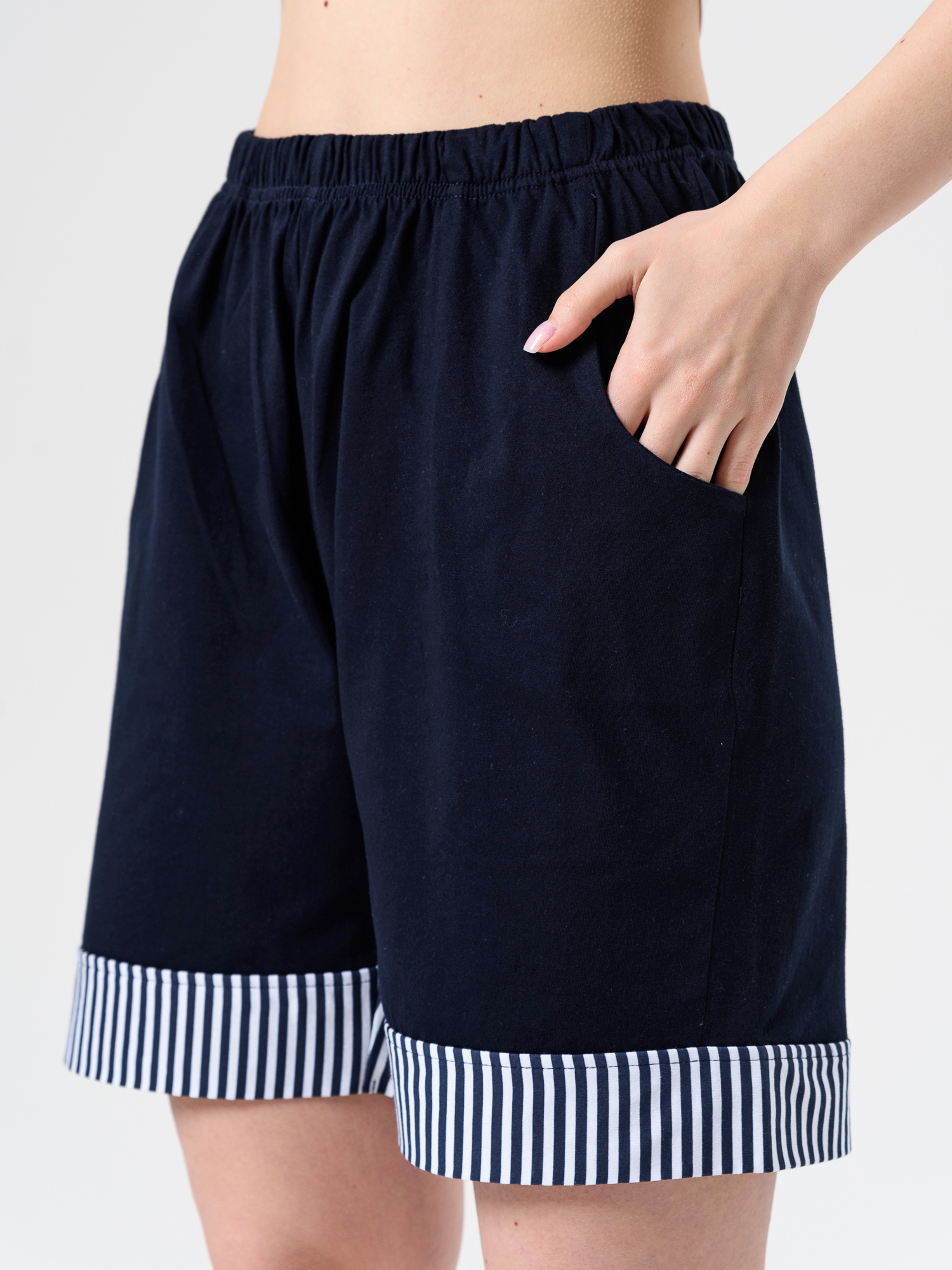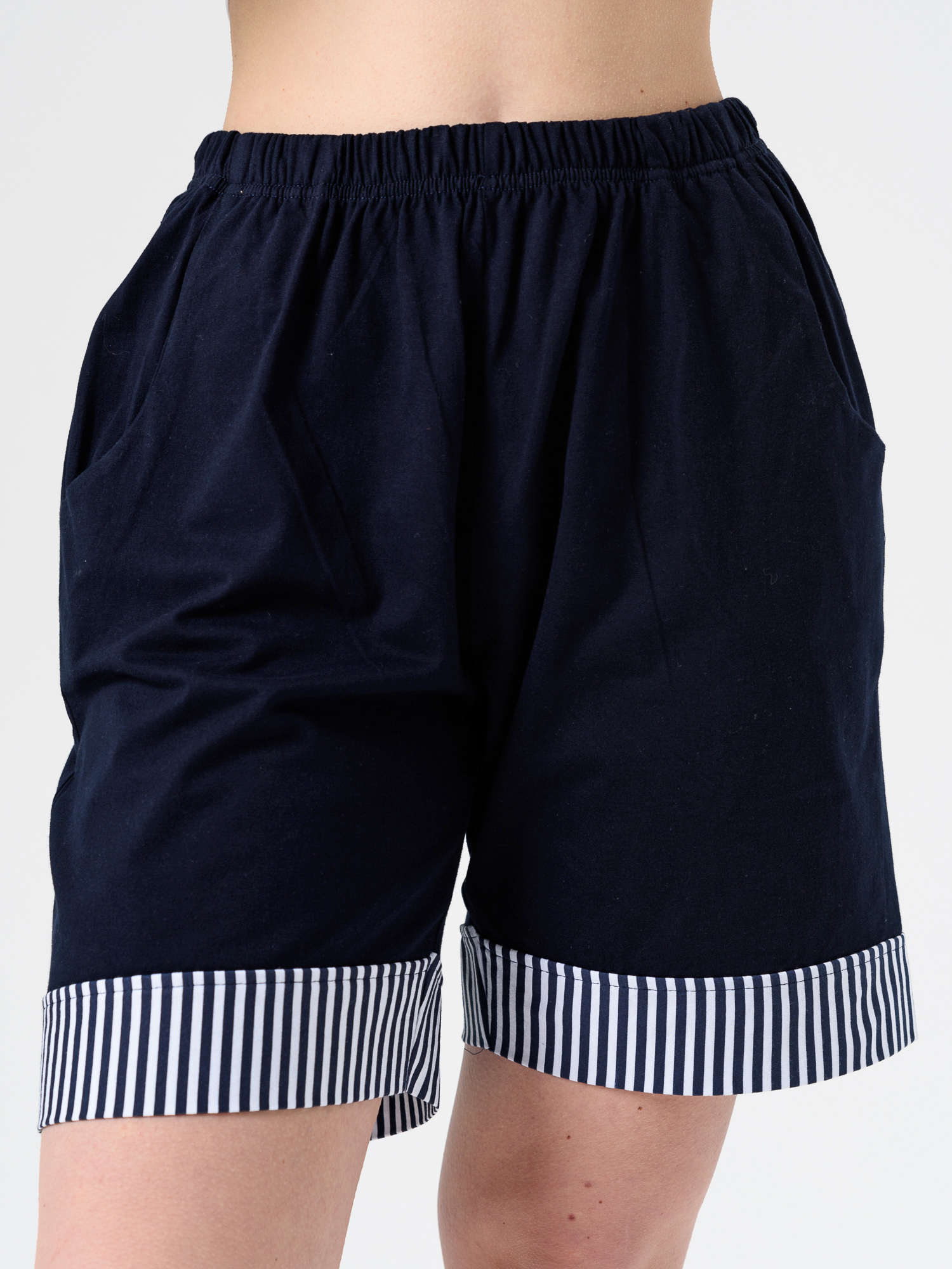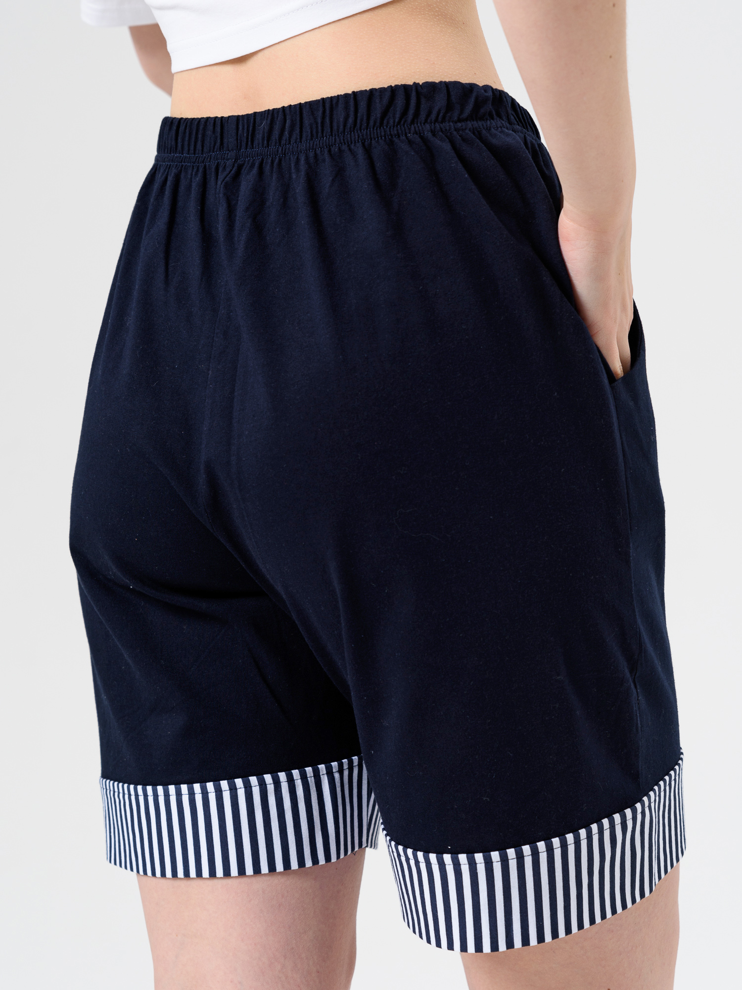 Шорты женские на притачном поясе, с карманами, и отрезными манжетами, имитирующими отворот. Вход в карман окантован. Манжеты и окантовка из отделочного материала.