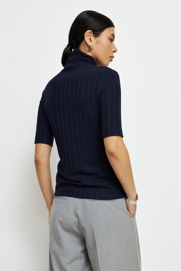 Джемпер прилегающего силуэта из фактурного эластичного полотна. Втачной короткий рукав. Вырез горловины высокая стойка. Джемпер – это хорошая базовая вещь, подходящая для любого гардероба.