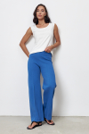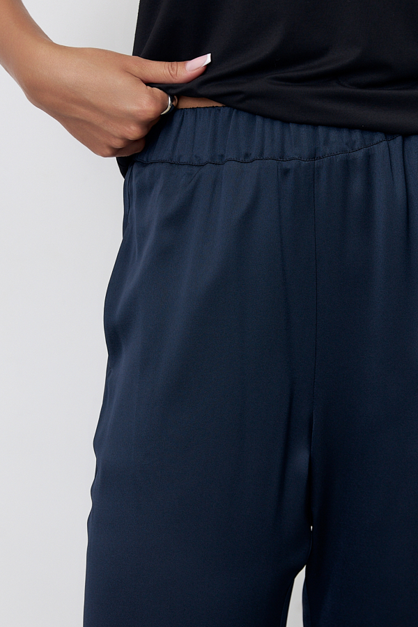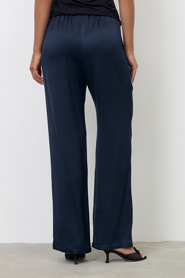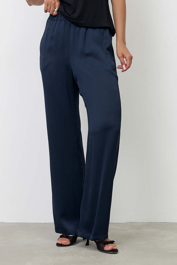 Брюки прямого силуэта из вискозной ткани с сатиновым блеском. Пояс притачной с эластичной резиной, в боковых швах карманы.