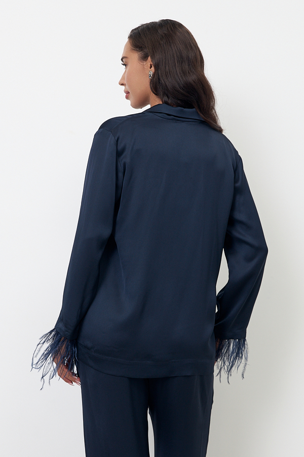 Блуза из вискозной ткани с сатиновым блеском. Свободный силуэт с английским воротником. Английский воротник визуально сделает фигуру стройнее, скроет недостатки и подчеркнет красивую линию груди. На передней части изделия застежка на пуговицы. Втачной длинный рукав. Низ рукава украшен декоративным элементом, который при желании можно отстегнуть. Перед стиркой декоративный элемент с перьями необходимо снять.