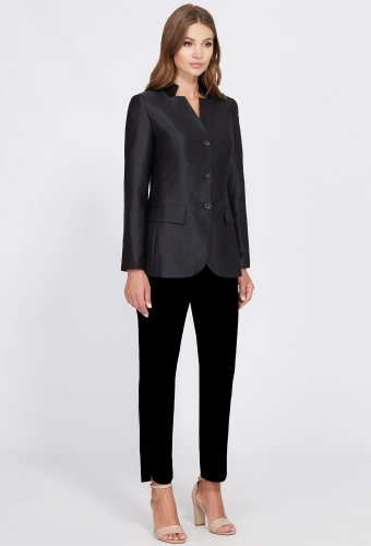 Элегантный однобортный жакет с широкими фигурными лацканами полуприлегающего силуэта выручит в любой ситуации. Перед с V-образным вырезом горловины, с центральной застёжкой на петли и пуговицы, с двумя функциональными карманами с клапанами и фигурной формой борта. Рукава втачные двухшовные с декоративными шлицами с отделочными пуговицами. На подкладке.