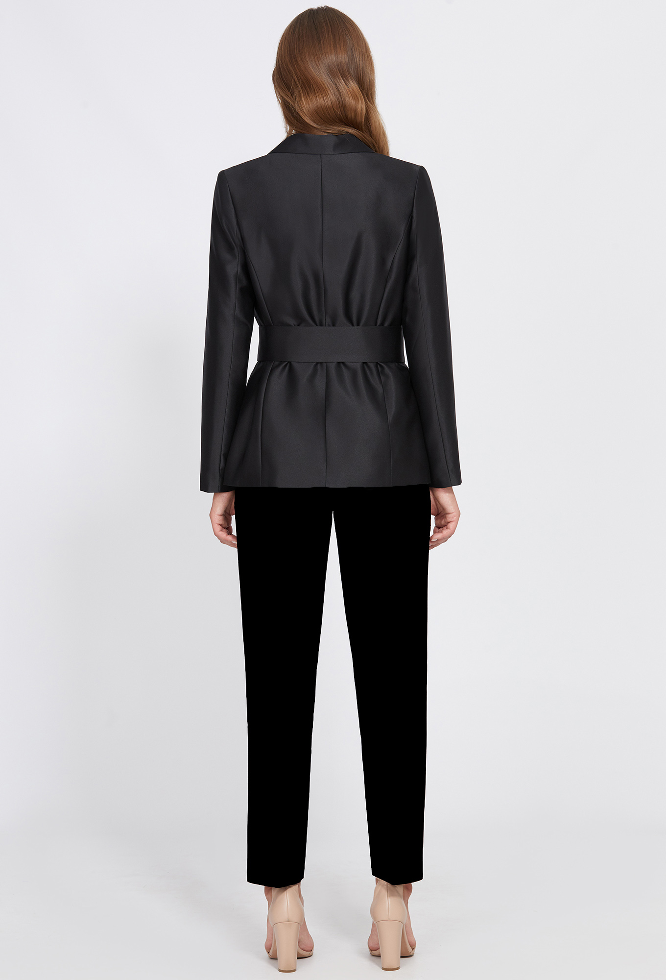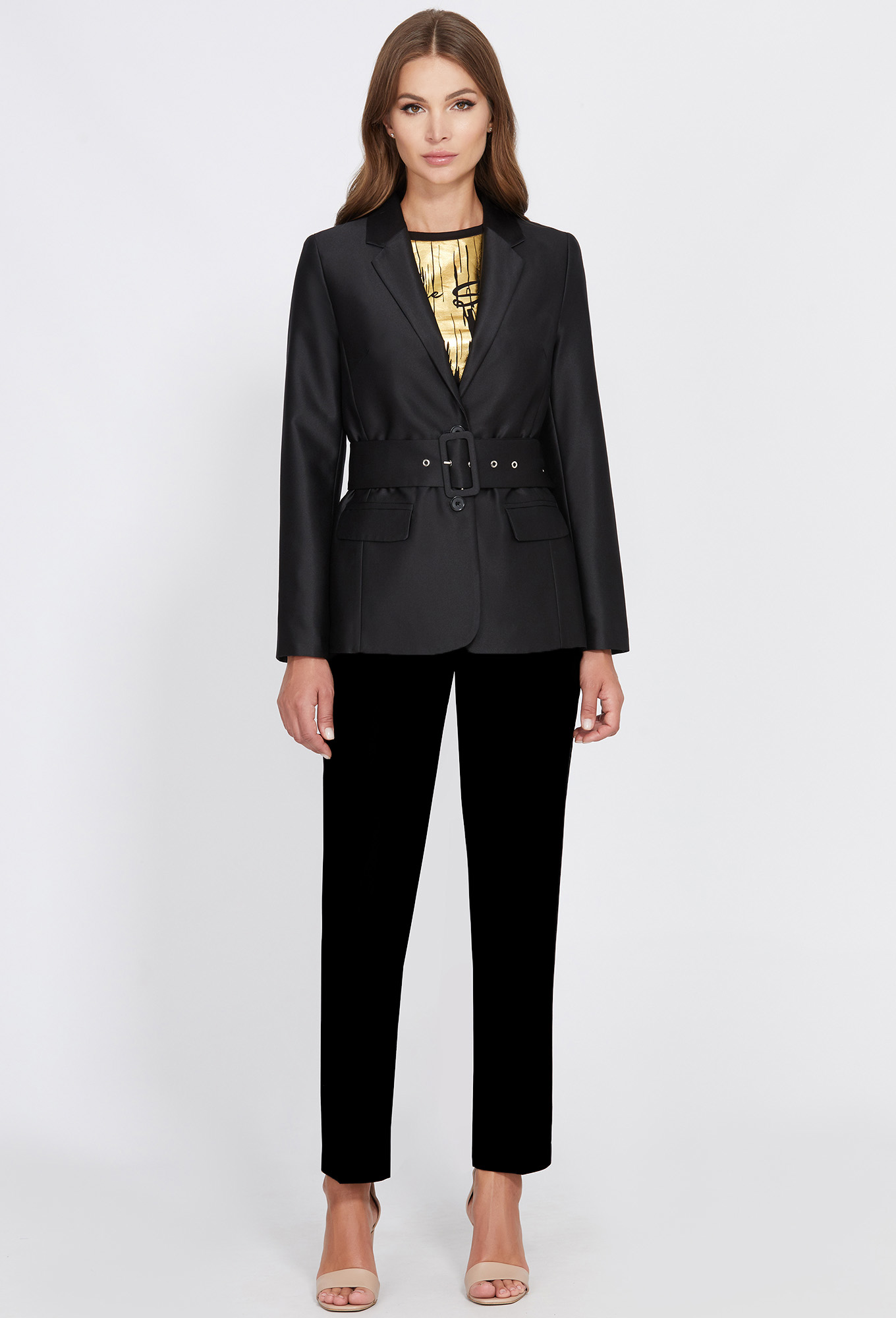 Жакет полуприлегающего силуэта с центрально-бортовой застёжкой на две петли-пуговицы. Перед с горизонтальными параллельными клапанами и рамками. Рукава втачные двухшовные. Воротник отложной с лацканами. На подкладке. Дополняется широким поясом с пряжкой из основной ткани.