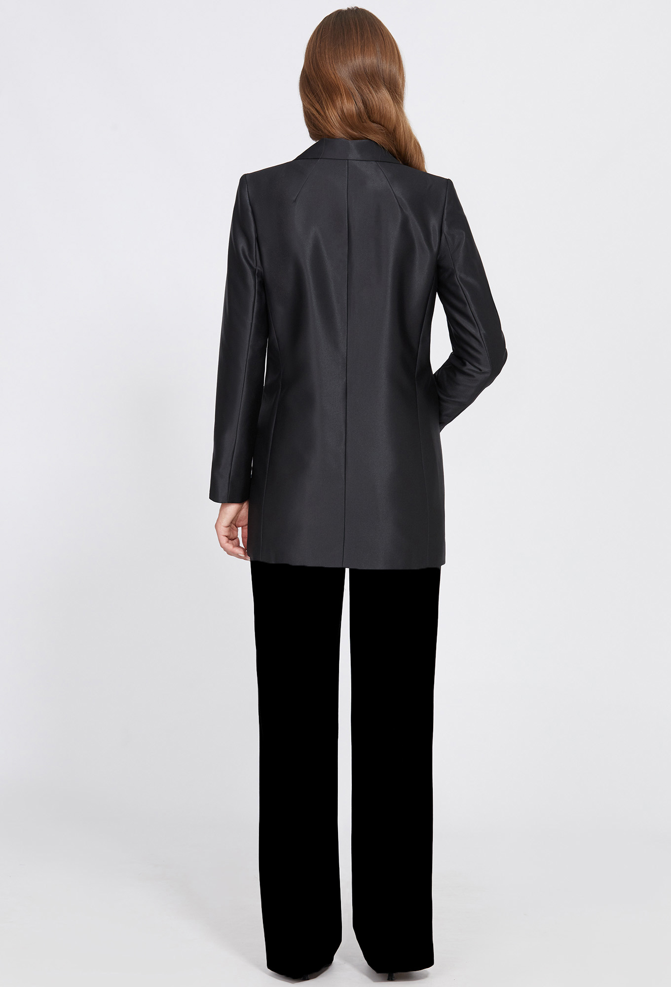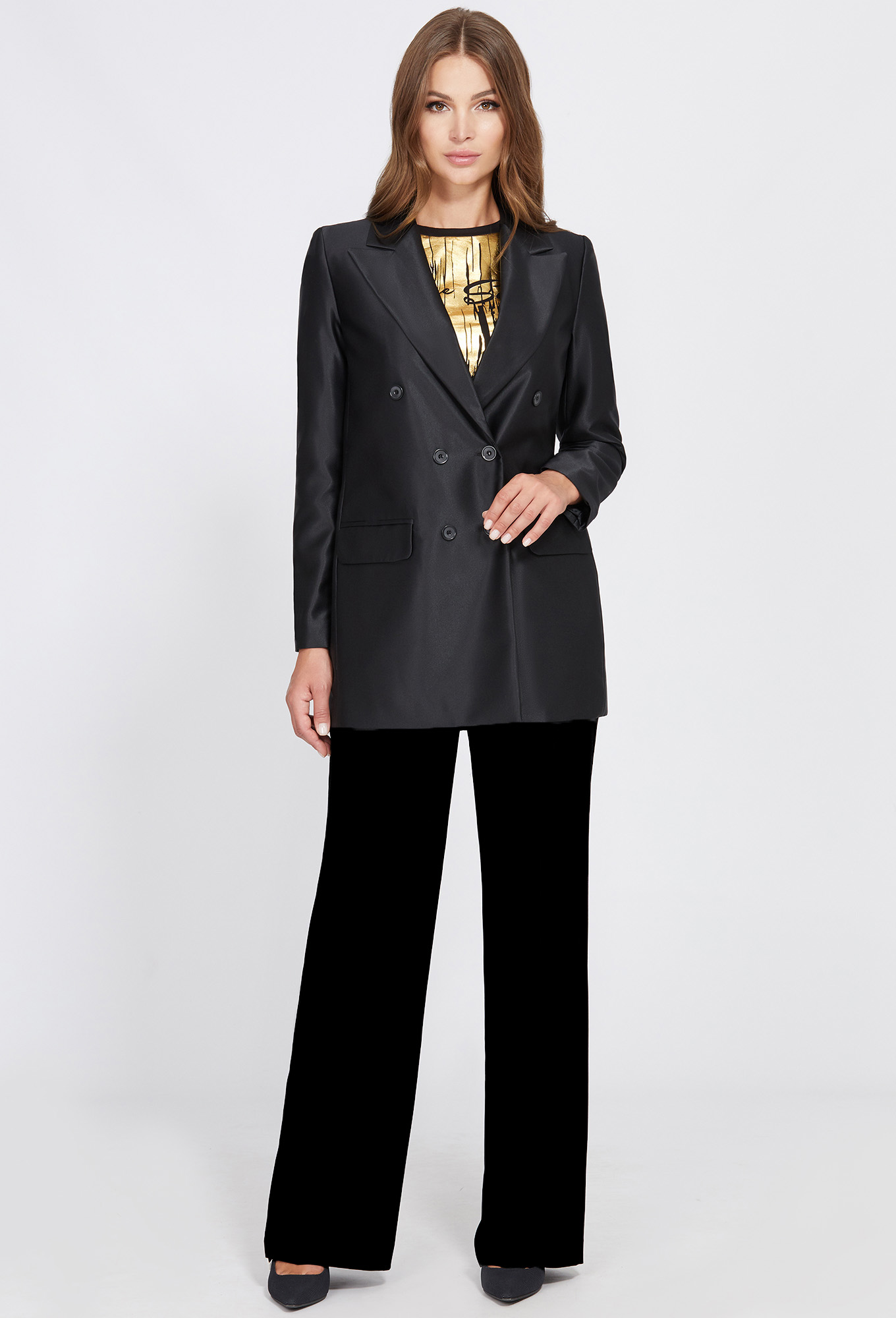 Удлинённый двубортный жакет прямого силуэта с застёжкой на петли, пуговицы бочком. Перед с горизонтальными карманами с рамками и клапанами. Спинка со средним швом. Рукава втачные двухшовные со шлицами и декоративными пуговицами. Воротник отложной с лацканами. Жакет на подкладке с плечевыми накладками.