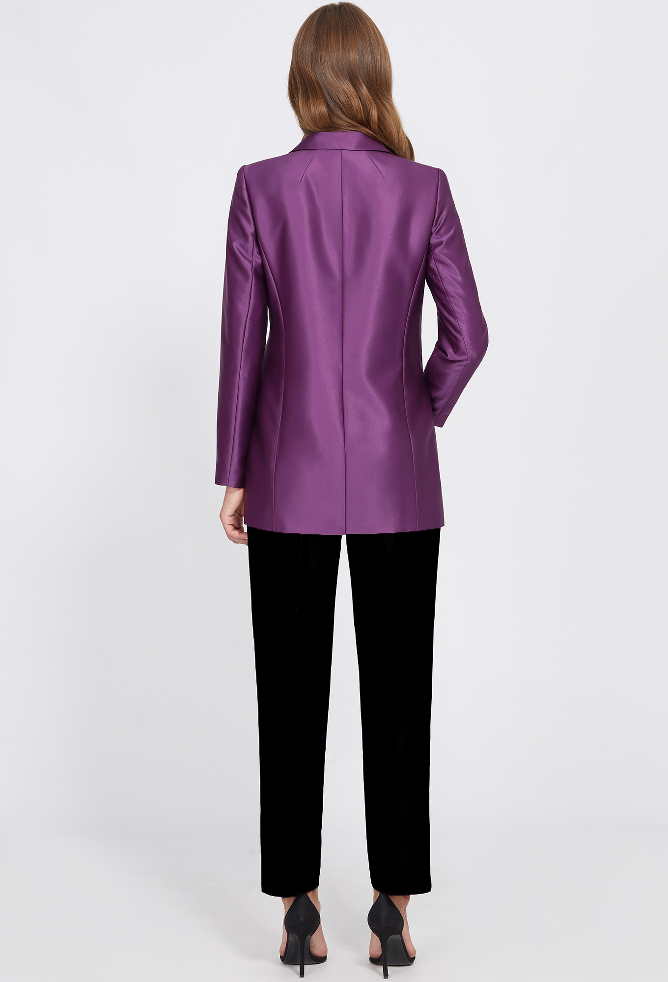 Двубортный удлинённый жакет с застёжкой на петли-пуговицы. Перед с двумя карманами-обманками с рамками и двумя прорезными карманами с клапанами и листочками. Рукава втачные двухшовные, передние швы со шлицами и отделочными пуговицами. Воротник отложной с широкими лацканами. На подкладке