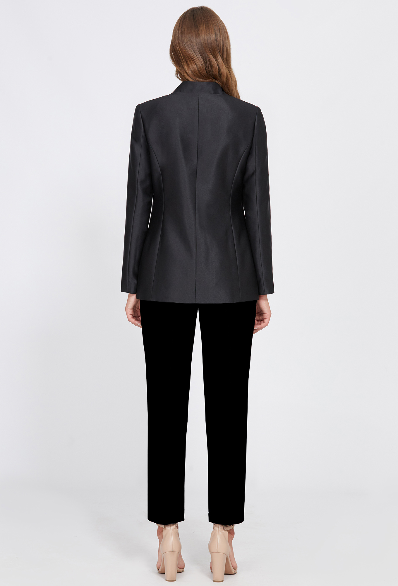 Удобный однобортный жакет полуприлегающего силуэта выполнен из приятной на ощупь ткани. Модель станет удачным вложением в гардероб: днём она будет уместно смотреться в офисе, а вечером в ней можно отправиться на светское мероприятие. Перед с фигурным вырезом горловины, с застёжкой на петли-пуговицы и двумя функциональными карманами с рамками. Рукава втачные двушовные. Воротник-стойка. На подкладке.
