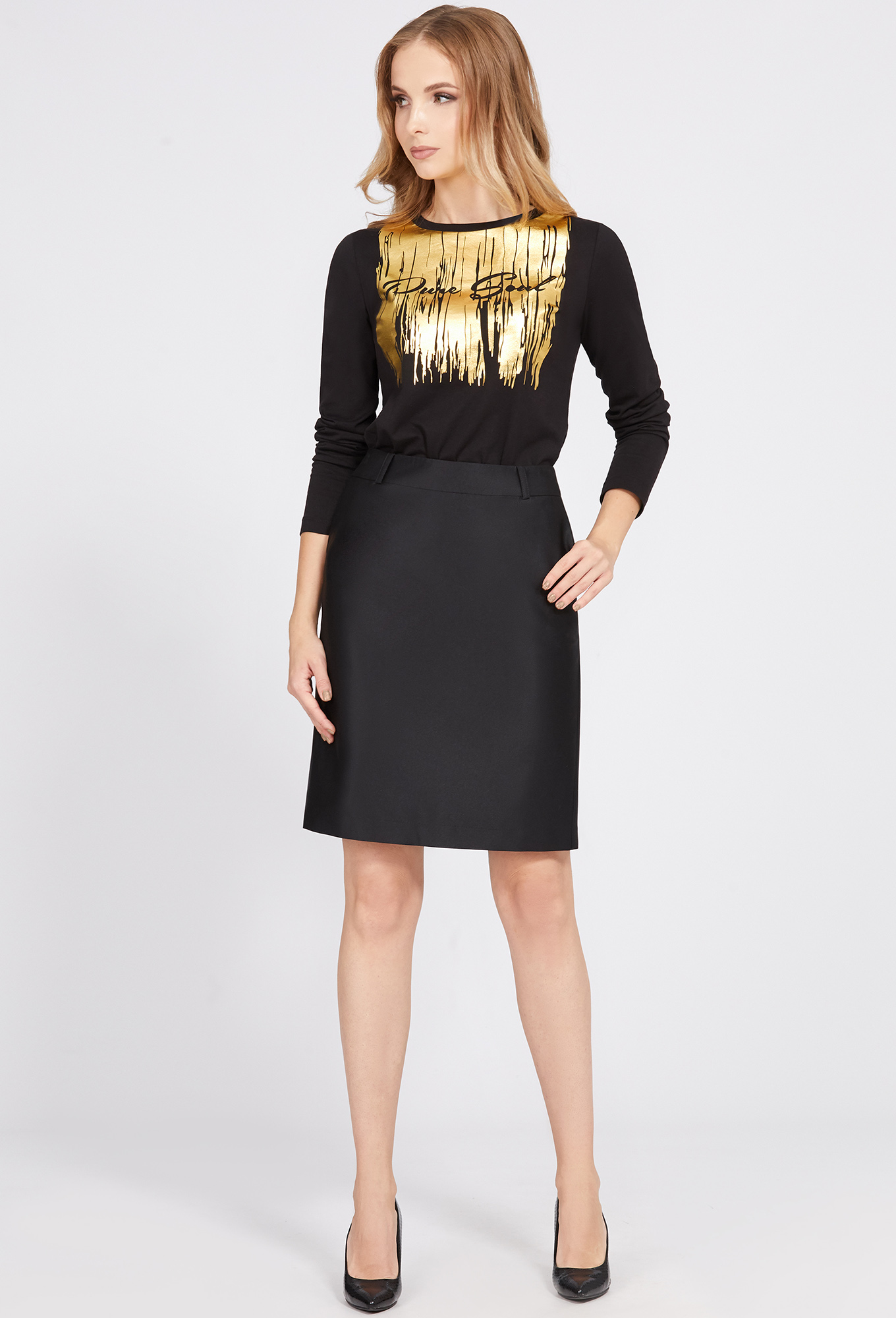 У юбки передняя половина с косыми карманами, в среднем шве задней половины юбки обработаны потайная молния и шлица. На подкладке.