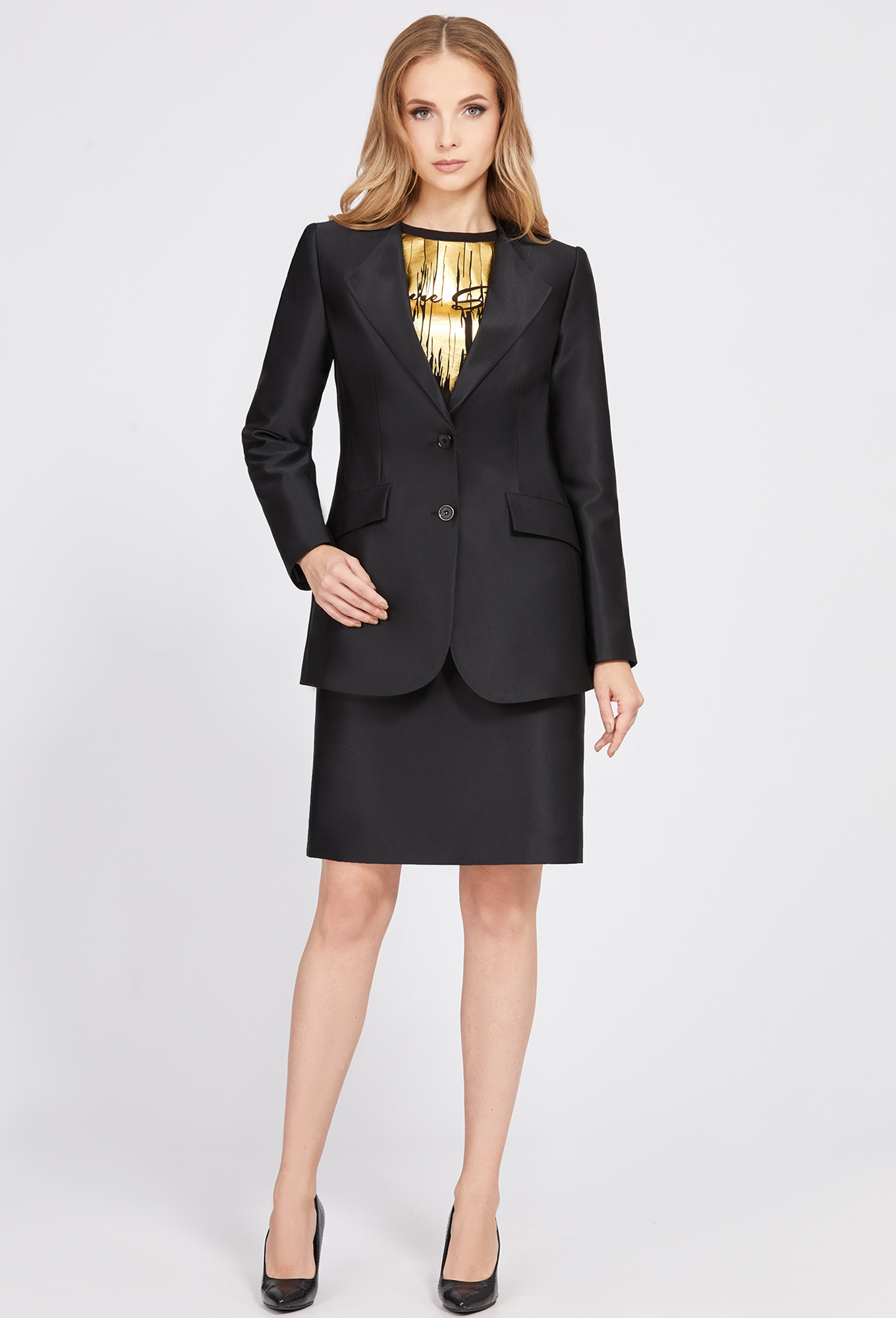 Элегантный однобортный жакет с широкими фигурными лацканами полуприлегающего силуэта выручит в любой ситуации. Перед с V-образным вырезом горловины, с центральной застёжкой на петли и пуговицы, с двумя функциональными карманами с клапанами и фигурной формой борта. Рукава втачные двухшовные с декоративными шлицами с отделочными пуговицами. На подкладке.