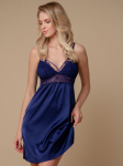 Домашняя женская сорочка синего цвета с треугольными чашечками и тонкими регулируемыми бретелями имеет свободный крой и длину, без косточек и без дополнительной поддержки груди, со стрепами, с кружевными вставками и обрамлением.