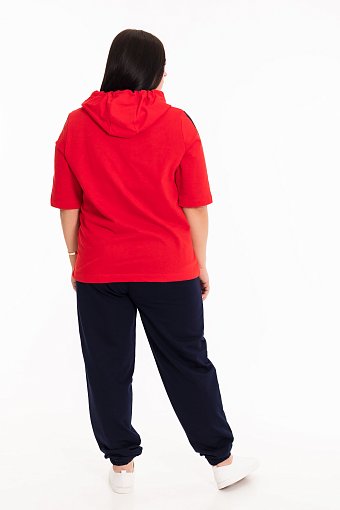 Женский костюм выполнен из хлопкового футера. Толстовка с короткими рукавами, прорезными карманами и застёжкой на молнию. Ширина капюшона регулируется при помощи шнура. Брюки с карманами по бокам, пояс и низ брюк на резине.